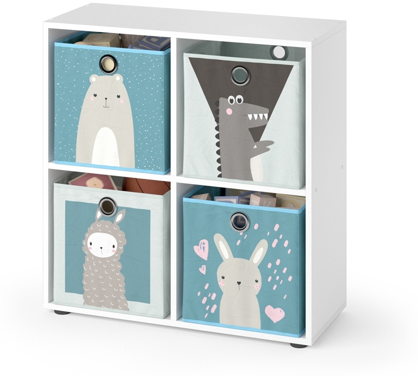 | Name | Kinderregal Tetra Weiß 72.6 x 72 cm mit 4 Faltboxen (grau/blau) Vicco |