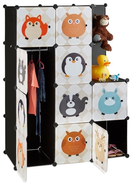 Das Relaxdays Steckregal ist der perfekte bunte Kleiderschrank für das Kinderzimmer. Mit lustigen Tiermotiven wie Eule und Fuchs bringt es Farbe und Freude in den Raum. Der geschlossene Kleiderschrank bietet viel Stauraum für Kleidung, Bücher und Spielzeug, während die offenen Ablagen zusätzlichen Platz bieten. Die robusten Kunststoffelemente sind pflegeleicht und lassen sich einfach reinigen. Der Aufbau erfolgt unkompliziert ohne Bohren und Schrauben. **Highlights** - Bunte Türen mit verschiedenen Tiermotiven - Viel Stauraum für Kleidung, Bücher und Spielzeug - Pflegeleichte, robuste Kunststoffelemente - Einfache Montage ohne Bohren und Schrauben - Offene Ablagen für zusätzlichen Platz **Produkteigenschaften** - Steckregal in schwarzer Farbe - Gesamtmaße H x B x T: ca. 145 x 110,5 x 46,5 cm - Maße Kleiderstangenfach H x B x T: ca. 106,5 x 35 x 45 cm - Maße kleine Fächer je H x B x T: ca. 35 x 35 x 45 cm - Viereckige Ablage H x B x T: ca. 35 x 35 x 45 cm - Gewicht: ca. 9,2 kg - Traglast: max. 8 kg pro Fach - Material: Kunststoff, Metall **Lieferumfang** - 1 x Kinderzimmer Steckregal (1 Kleiderstange, 2 Ablagen, 37 Böden/Wände, 10 Türen, 38 Verbindungsstücke) - Inkl. beispielhafter Aufbauanleitung und Holzhammer - Dekorationsartikel sind nicht im Lieferumfang enthalten
