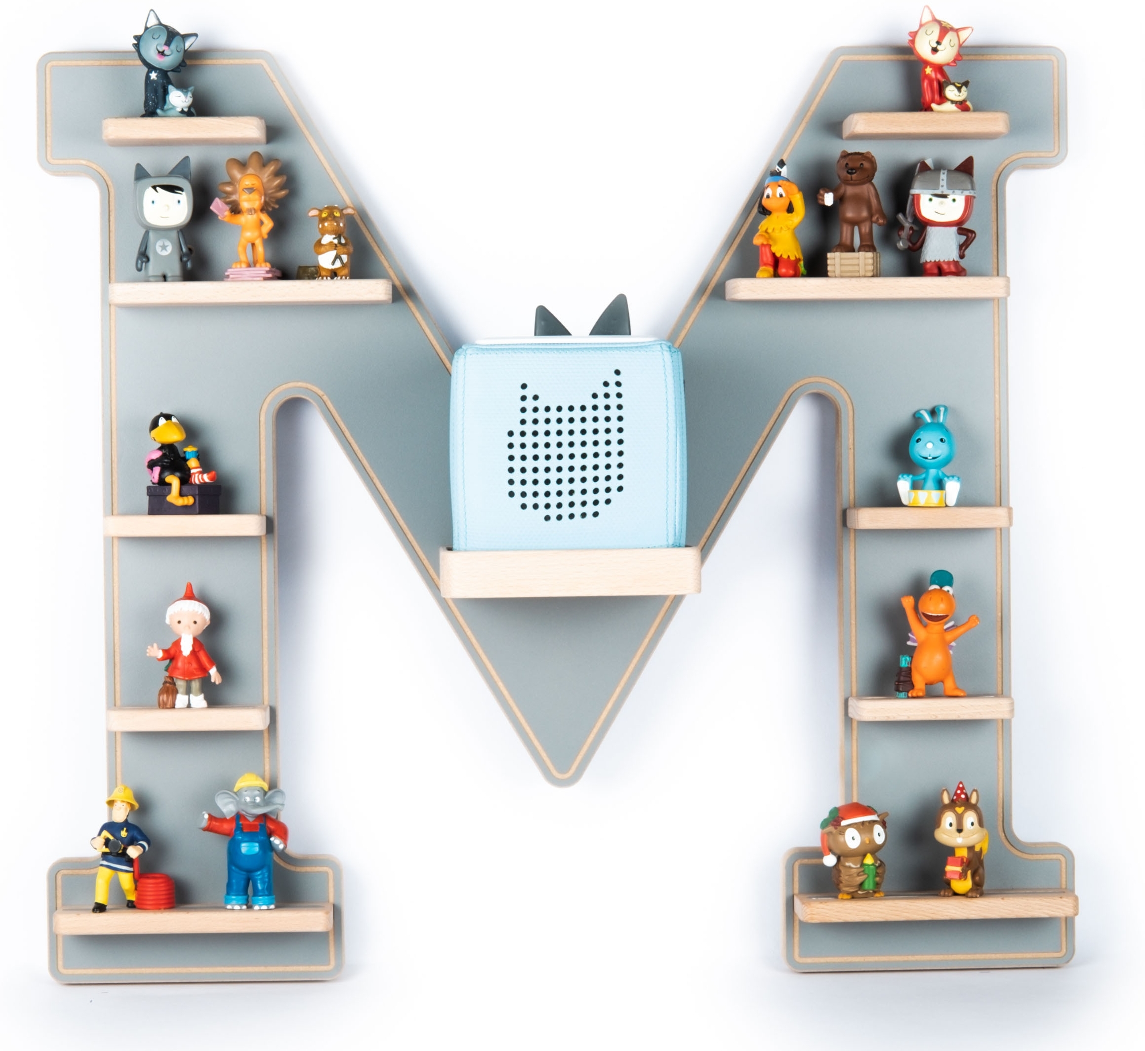 Das ist für Alle, die Buchstaben genauso lieben wie wir. Unser Board \"Letter M\" im College Style ist perfekt für Max und Mia, Matheo, Mauritz und Mila und Marie... Hier ist jedem gleich klar, wem die Box samt Sammlung gehört. Ein klares Statement-Board fürs Kinderzimmer. Aufgeräumt und dann noch gut aussehen: hier finden Ladestation und Figuren ihren Platz. Nix fliegt rum, alles an Ort und Stelle und dann noch in richtig cooler Optik. Das \"M\" hat Platz für ca. 48 Figuren. Aufhängen: Du montierst ganz schnell und einfach die Regalböden und die Halterung für die Ladestation und kannst das Board dann direkt an die Wand bringen - für eine Vorbohrung ist bereits gesorgt. Abhängen: Einfach Deinen Musikwürfel auf die Freifläche stellen, Deine Figuren einstellen und schon kann der Hörspielspaß beginnen. P.S.: Die Metallstreifen im Regal sind bei uns serienmäßig. Da \"kleben\" die Figuren schön an Ort und Stelle. Maße: ca. 54 x 60 x 19 cm (BxHxT) Material: Dekorativer beschichteter Holzwerkstoff zur Verwendung im Innenbereich mit Konturfräsung Gewicht: 2,5kg