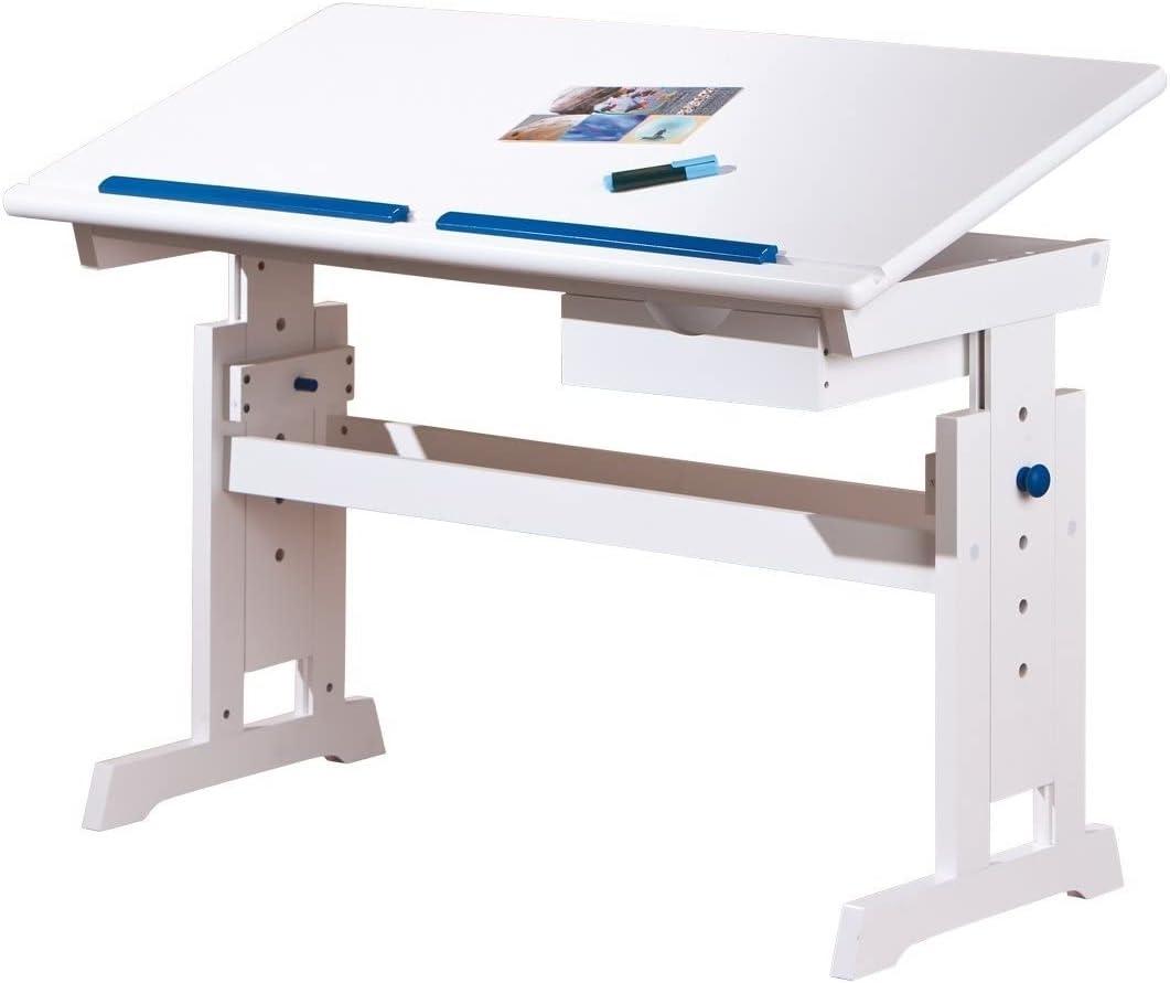 Der Kindertisch 'Baru' von Inter Link kann mit wenigen Handgriffen an die Größe des Kindes angepasst werden und ermöglicht ein entspanntes Lernen in der richtigen Körperhaltung: So werden Haltungsschäden, die durch langes, falschen Sitzen entstehen können, vorgebeugt. Die neigbare Tischplatte verfügt über zwei Halter, die das Ablegen von Heften und Büchern in geneigter Position möglich machen. Die Applikationen in den Farben Blau und Rosa sind im Lieferumfang enthalten. So können Sie frei entscheiden, welche der beiden Kombinationen Ihnen besser gefällt. Die Schublade bietet Platz, um Dinge verstauen zu können, die zum Lernen benötigt werden. Um den natürlichen Massivholz-Charakter hervorzuheben, wurde das Gestell in der Farbe Weiß so lackiert, dass die einzigartigen Maserungen sichtbar bleiben. Die Tischplatte ist weiß melaminbeschichtet und robust gegenüber Schmutz. Durch die glatte Oberfläche ist diese leicht zu reinigen. Aufgebaute Maße: 109 x 55 x 63-96 cm