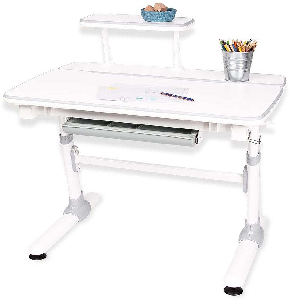- Kinderschreibtisch 'Liam', mit höhenverstellbarer Platte, 1 Schubkasten, 1 abnehmbaren Arbeitsplatte, 1 Haken für Taschen. Dekor: Uni, weiß und grau und Metall, weiß lackiert. - Maße B 98 x T 72 x H 58 bis 80 cm - Die Platte des Tisches ist mit einer Handkurbel stufenlos höhenverstellbar, für eine angenehme Sitzposition. Die große Arbeitsplatte mit 98x50 cm ist beweglich und lässt sich bis zu 25 Grad neigen. Die kleine Arbeitsplatte mit 98x22 cm ist unbeweglich - Dank des Schubkastens mit der praktischen Einteilung können Hefte, Stifte und andere Schreibutensilien problemlos verstaut werden und sind beim Hausaufgaben machen und Lernen schnell zur Hand. Taschen lassen sich bequem am Haken aufhängen - Die verstellbaren Füße sorgen dafür, dass der Schreibtisch auch auf unebenen Böden sicher und gut steht. Durch 2 Rollen lässt sich der Tisch ganz einfach und schnell an jeden beliebigen Platz schieben