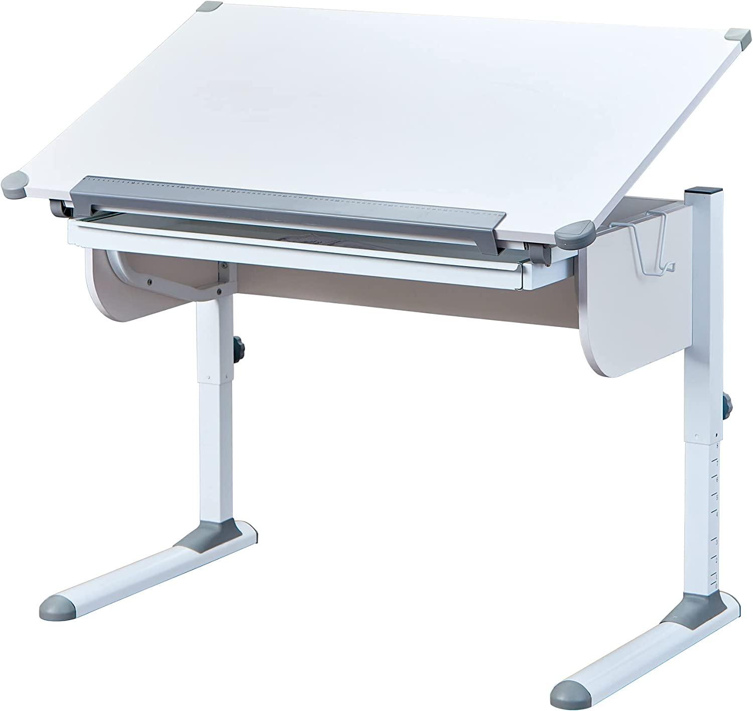 Der mitwachsende Kinderschreibtisch 'Studare' in Weiß ist die perfekte Lösung für die Entwicklung Ihres Kindes. Ergonomisch höhenverstellbar von 55 cm bis 78 cm und neigbar, passt er sich den Bedürfnissen Ihres Kindes an. Die melaminbeschichtete MDF-Tischplatte ist wasserabweisend und schmutzfest. Mit einer praktischen Skalierung von 1 bis 80 cm und einer Schublade mit Push-to-open-Funktion bietet er ausreichend Stauraum. Ein stabiles Metallgestell und ein Haken für die Schultasche runden das durchdachte Design ab. **Highlights** - Mitwachsender Kinderschreibtisch - Ergonomisch höhenverstellbar und neigbar - Wasserabweisende und schmutzfeste Tischplatte - Schublade mit Push-to-open-Funktion - Stabiles Metallgestell **Produkteigenschaften** - Maße: 110 x 68 x 55-78 cm - Material: Melaminbeschichtete MDF-Platte - Skalierung von 1 bis 80 cm auf der Tischplatte - 6-fach arretierbare neigbare Tischplatte - Gaslift-Dämpfer an der Tischplatte - Schutzecken gerundet - Inkl. Taschenhalter **Lieferumfang** - Zerlegt zur Selbstmontage - Montageanleitung