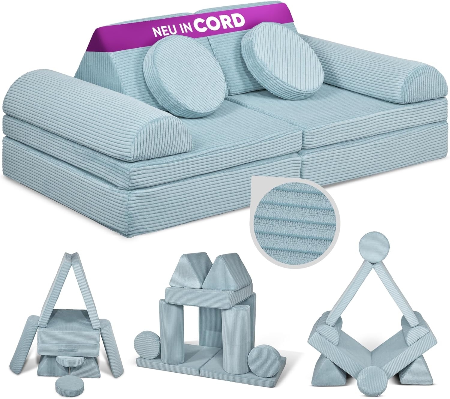 | Beschreibung | Das Linodino Kindersofa „Fantasiewelt“ ist ein kreativer Indoorspielplatz für Kinder. Mit zwei Klappmatratzen, zwei Dreieckskissen, zwei runden Kissen und zwei halbrunden Lehnen bietet es vielseitige Kombinationsmöglichkeiten. Der formstabile Schaumstoff sorgt für eine sichere und bequeme Spielumgebung. Die pflegeleichten Cord-Bezüge sind abnehmbar und waschbar. Mit einer Liegefläche von 150x66 cm eignet sich das Sofa auch als Gästebett. Eine 3-jährige Garantie auf Formbeständigkeit rundet das Angebot ab. **Highlights** - Modularer Aufbau für kreative Spielmöglichkeiten - Formstabiler Schaumstoff für Sicherheit und Komfort - Abnehmbare, waschbare Cord-Bezüge - Integrierter, wasserdichter Unterbezug - 3 Jahre Garantie auf Formbeständigkeit **Produkteigenschaften** - Maße Liegefläche: 150x66 cm - Bezüge: Cord - Pflege: Maschinenwaschbar bei 30°C - Sicherheitsmerkmale: Versteckte Reißverschluss-Garagen **Lieferumfang** - 2x Klappmatratzen - 2x Dreieckskissen - 2x runde Kissen - 2x halbrunde Lehnen - Ausschluss von optionalem Zubehör |