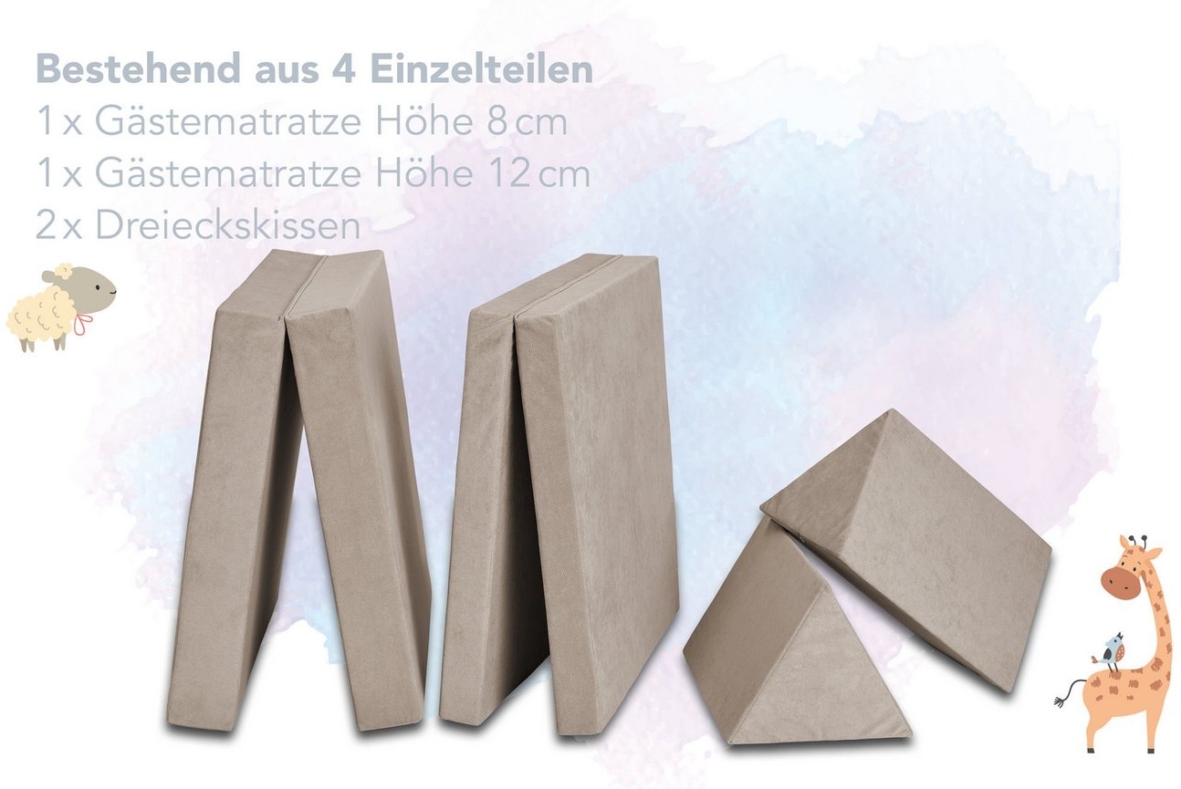 | Lieferumfang | 2x klappbare Matratze, 2x dreieckförmiges Kissen, 1x Bezug |
