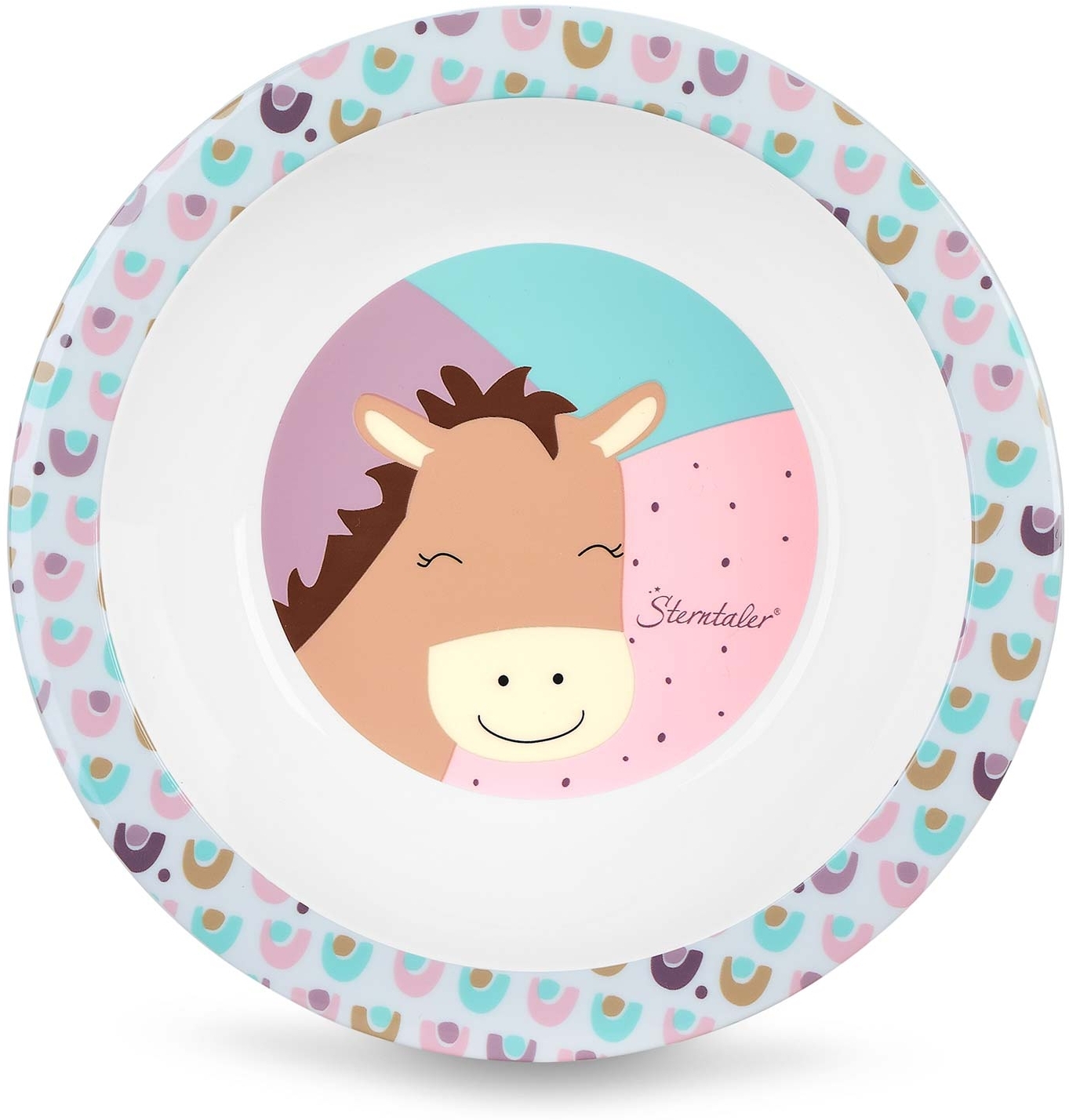 Die Sterntaler Kinderschale Pauline mit einem Durchmesser von 14,2 cm begeistert Kinder durch ihr schönes Pony-Motiv. Die rutschfeste Unterseite sorgt für sicheren Halt, während die lebensmittelechte Schale spülmaschinengeeignet ist. Sie ist nicht für die Mikrowelle geeignet und wird für Kinder ab 6 Monaten empfohlen. Bitte verwenden Sie die Schale nur unter Aufsicht von Erwachsenen und prüfen Sie sie vor Gebrauch auf Beschädigungen. **Highlights** - Schönes Pony-Motiv - Rutschfester Unterteil - Lebensmittelecht - Spülmaschinengeeignet - Empfohlen ab 6 Monaten **Produkteigenschaften** - Durchmesser: 14,2 cm - Material: Polypropylen - Pflegehinweise: Spülmaschinengeeignet - Empfohlenes Alter: ab 6 Monaten - Warnhinweis: Nur unter Aufsicht verwenden
