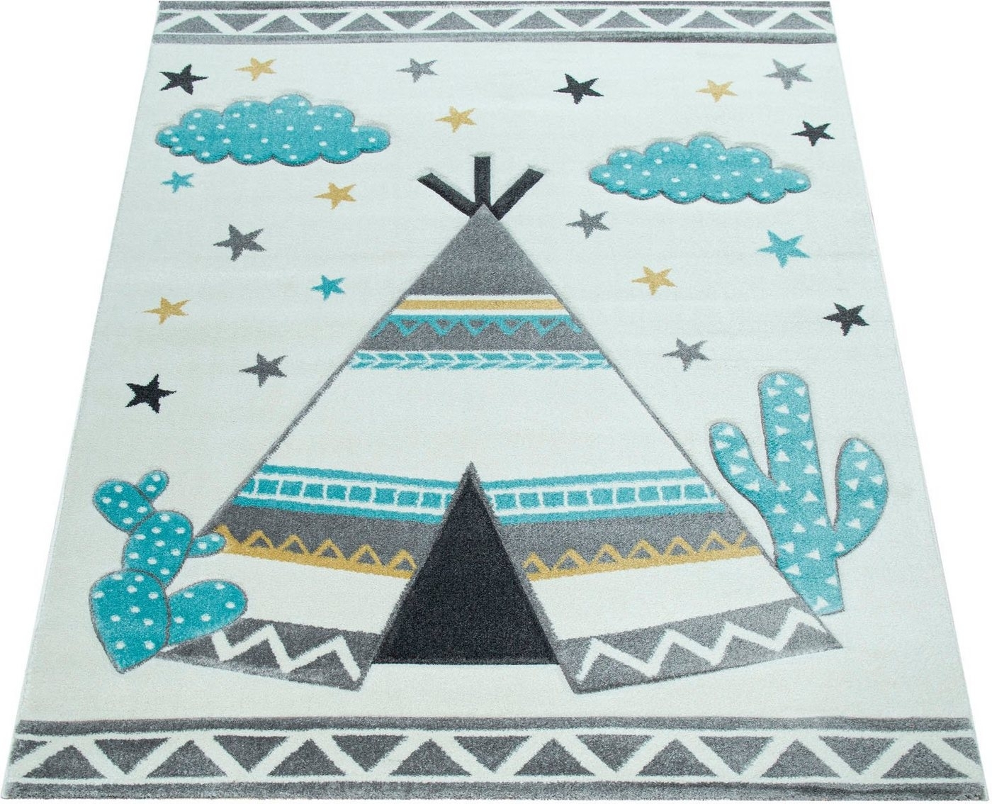 Paco Home Kinderteppich Ela 215rechteckig, Höhe: 16 mm, Kurzflor, 3D-Design, Motiv Zelt, Wolken & Sterne, Kinderzimmer