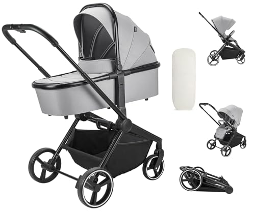 Booboo Kinderwagen Jazzi 2 in 1 Kombi-Kinderwagen inkl. Babywanne mit MatratzeSportwagen, Sportsitz mit Liegefunktion, Zusammenklappbar - Grey