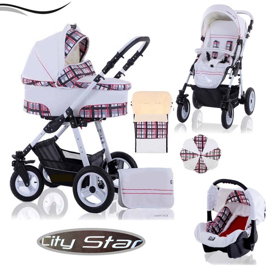 IHR SORGLOSPAKET - Mit diesem Kinderwagen bleiben keine Wünsche offen! Geeignet vom Neugeborenen bis zum Kleinkind (ca. 4 Jahre. Die Lieferung erfolgt mit Babywanne, Babyschale/Autositz Gruppe +0 und Sportsitz (ab dem 6. Monat). Alle drei Aufsätze können Sie in beide Fahrtrichtungen montieren. Das Zubehör wie Wickeltasche, Abdeckung für die Wanne, Beindecke für den Sportsitz sind farblich passend. Die mitgelieferte Regenfolie und Moskitonetz schützen Ihr Kind vor Nässe und Insekten. KOMFORT: Die Babywanne wird geliefert mit einer herausnehmbaren und waschbaren Matratze sowie einem Inlay. Die Rückenlehne der Wanne ist in mehreren Stufen einstellbar. Der Große Tragegriff an der Haube bietet optimale Sicherheit beim Transportieren. Die Haube verfügt zudem über ein Ventilationsnetz - optimal an warmen Sommertagen. Inkl. Sonnenschirm und Fußsack. GELÄNDETAUGGLICH UND SICHER: Gleich in welchem Gelände Sie mit dem City Star fahren möchten: mit den 360 ° schwenkbaren und feststellbaren Vorderrädern und der einstellbaren Federung der Hinterräder bietet der City Star Komfort und Sicherheit. Der Autositz ist inkl. Sitzverkleinerer, 3 Punkt-Sicherheitsgurt, einem Sonnen- und Fußverdeck sowie einem Adapter (zur Montage auf das Kinderwagengestell). Der Autositz entspricht ECE-R 44/04. Die Babyschale verfügt zudem über eine Schaukelfunktion. ALL INCLUSIVE: Ab dem 6. Monat kann der Sportsitz verwendet werden. Er wird geliefert mit einem Fünfpunkt-Sicherheitsgurt und einer Schrittpolsterung die für eine perfekte Sitzform und Sicherheit sorgt. Die Rückenlehne und die Fußablage sind in vier Stufen bis zur Liegeposition verstellbar. Im Lieferumgang sind außerdem ein gepolsterter Bauchbügel (rausfallschutz) sowie eine gepolsterte Beindecke für kühle Tage enthalten. PRODUKT/AUFBAUVIDEO - be/ZFG Qg ZWT3q I