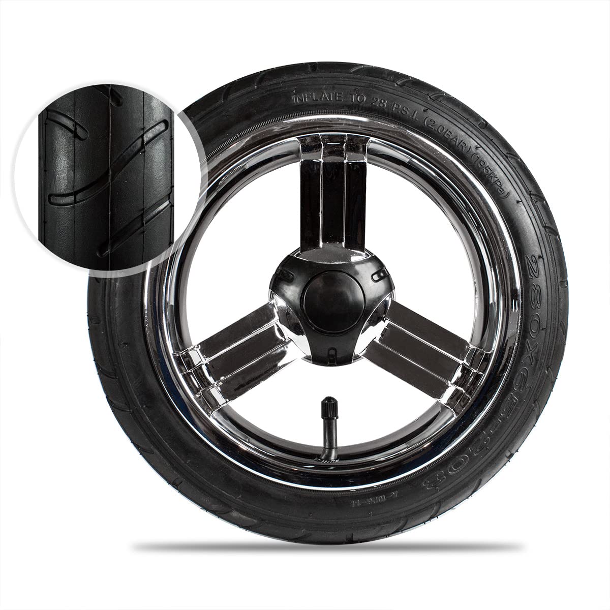- Es verfügt über eine Felge in Chrom-Optik und einen 12 Zoll Schlauch