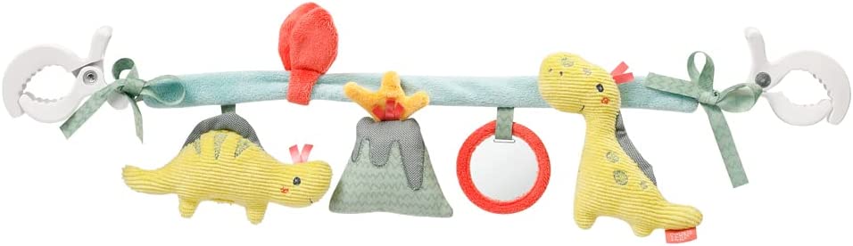 - Die Kinderwagenkette Happy Dino bietet eine Vielzahl von Spielmöglichkeiten mit Tierstimme, Raschelpapier, Spiegel, Rassel und Quietsche, die das Greifen und Fühlen fördern.