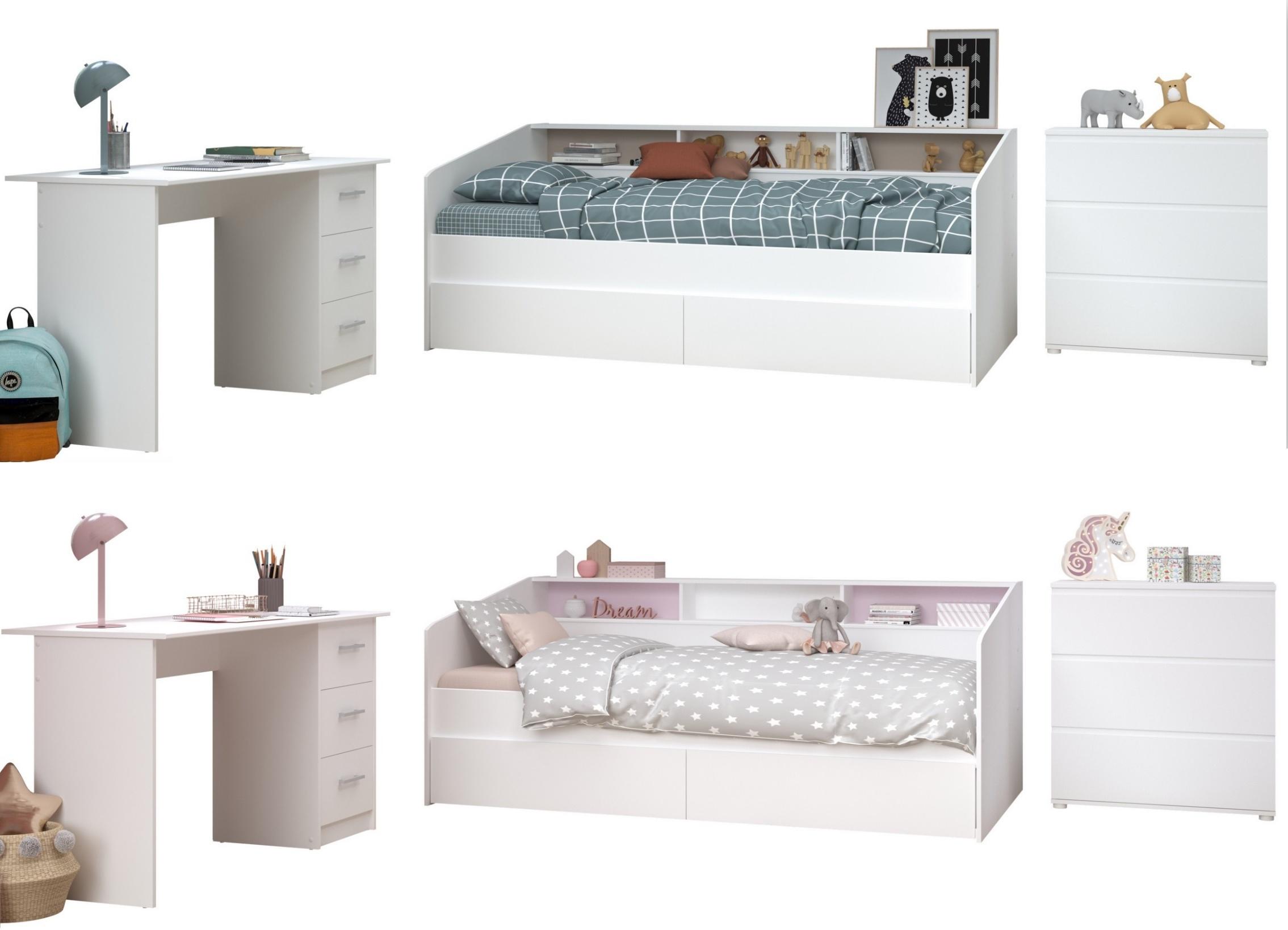 Nachts ein Schlaf(t)raum und tagsüber ein Jugendzimmer. Das 3-teilige Zimmer-Set Sleep von Parisot besteht aus einem Stauraumbett, einem Schreibtisch und einer Kommode. Diese Jugendmöbel erfüllen das Jugendzimmer mit ihrer schönen Optik mit Leben. Es wurde an alles, was Ihr Kind haben muss, gedacht. Die langlebigen Metallbeschläge stehen für Qualität und Sicherheit und machen die Möbel zu einem Qualitätsmöbel von Parisot. Die beiden Bettkästen gehören zum Lieferumfang! Hier kann man perfekt relaxen, die Beine einfach mal hochlegen und nachts Kraft für den nächsten Tag tanken. Viel Spaß beim Einrichten! Produktbeschreibung Material: Holznachbildung Farbe: Weißinklusive Bettinklusive 2 Bettkästeninklusive 3 offener Fächerinklusive Schreibtischinklusive Kommode Rückwand einzeln drehbar in 4 Farben (Ablagefächer Bett)ohne Matratze, Lattenrahmenstabile und gute Verarbeitung Artikel-Nr. 2944 bestehend aus: 1. Stauraumbett 90*200 cminkl. 2 Bettschubkästen 2. Schreibtischrechts: 3 große Schubladen auf leichtlaufenden, wartungsfreien Metallschienen 3. Kommode3 große Schubladen auf leichtlaufenden, wartungsfreien Metallschienen Gesamtmaße: Stauraumbett Matratzenmaß: 90x200 cm Gesamtlänge: 203 cm Gesamtbreite: 113 cm Gesamthöhe: 82 cm Schreibtisch Breite: 121 cm Höhe: 75 cm Tiefe: 55 cm Kommode Breite: 77 cm Höhe: 82 cm Tiefe: 40 cm Qualitätsmerkmale: PEFC zertifiziert (nachhaltige Waldbewirtschaftung)Hersteller zertifiziert nach ISO 14001 Marke: Parisot Pflegehinweis: die Oberfläche ist wenig pflegebedürftig - einfach mit einem feuchten Tuch abwischen zusätzlich gegen Mehrpreis erhältlich: Matratzen Schminktisch, Schränke, Nachtkommode Lattenrahmen (Nicht für Rollroste geeignet, da sich die Auflagepunkte für den Rahmen in den Ecken befinden) Lieferung zerlegt & kartonverpackt bis zur 1. verschließbaren Tür (Haustür)Selbstmontage mit Aufbauanleitung ca. 3,5 Std. Abholung nach Terminvereinbarung gerne bei uns möglich Wenn Sie Fragen oder einen Wunsch-Liefertermin haben - wir beraten Sie gerne