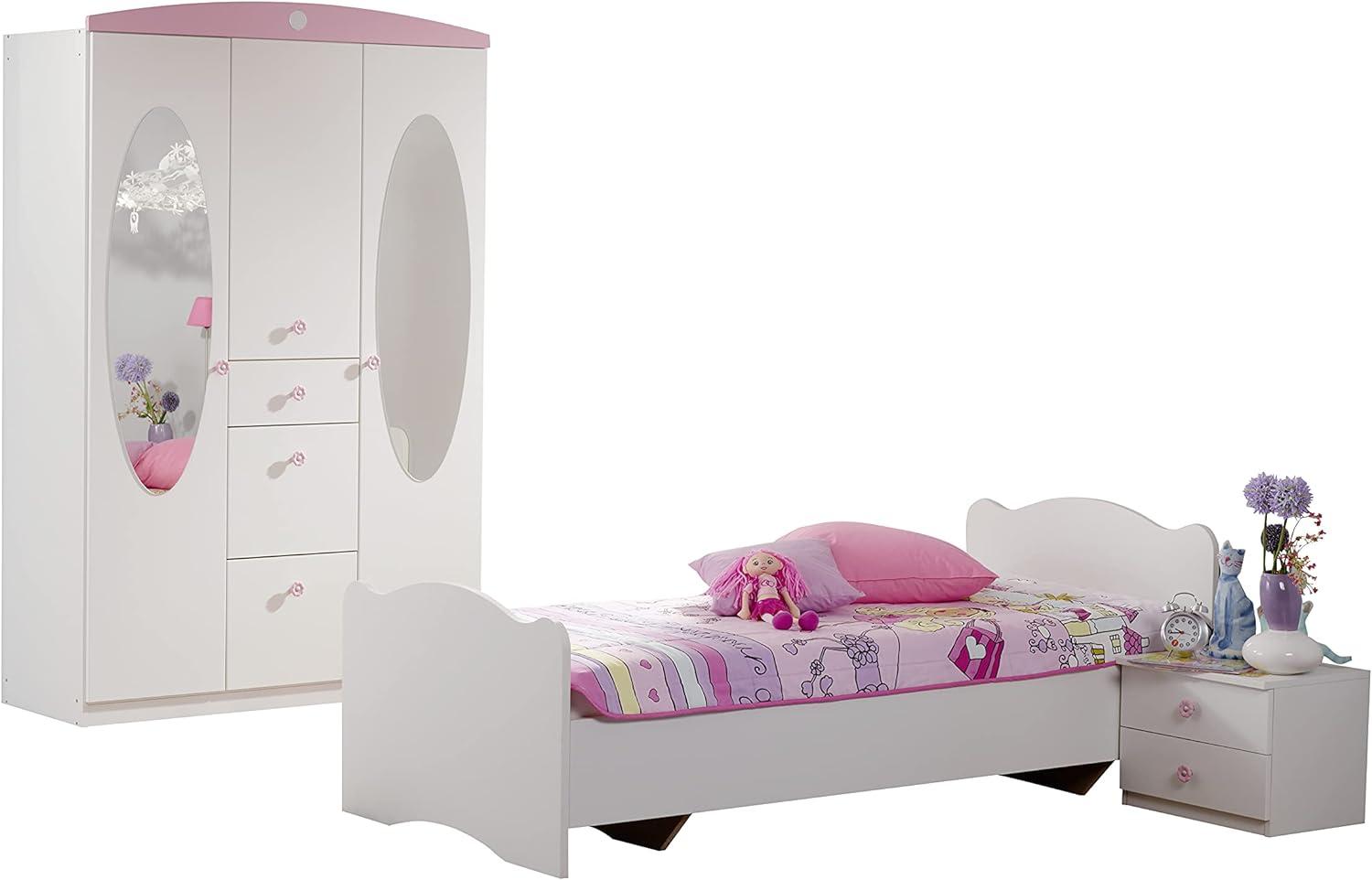 | Name | Rauch Möbel Tabea Kinderzimmer-Set 3-teilig, Weiß/Rosafarben, Schrank mit Spiegel 3-türig 3 Schubladen - Bett Liegefläche 90/200 - Nachttisch mit 2 Schubladen |