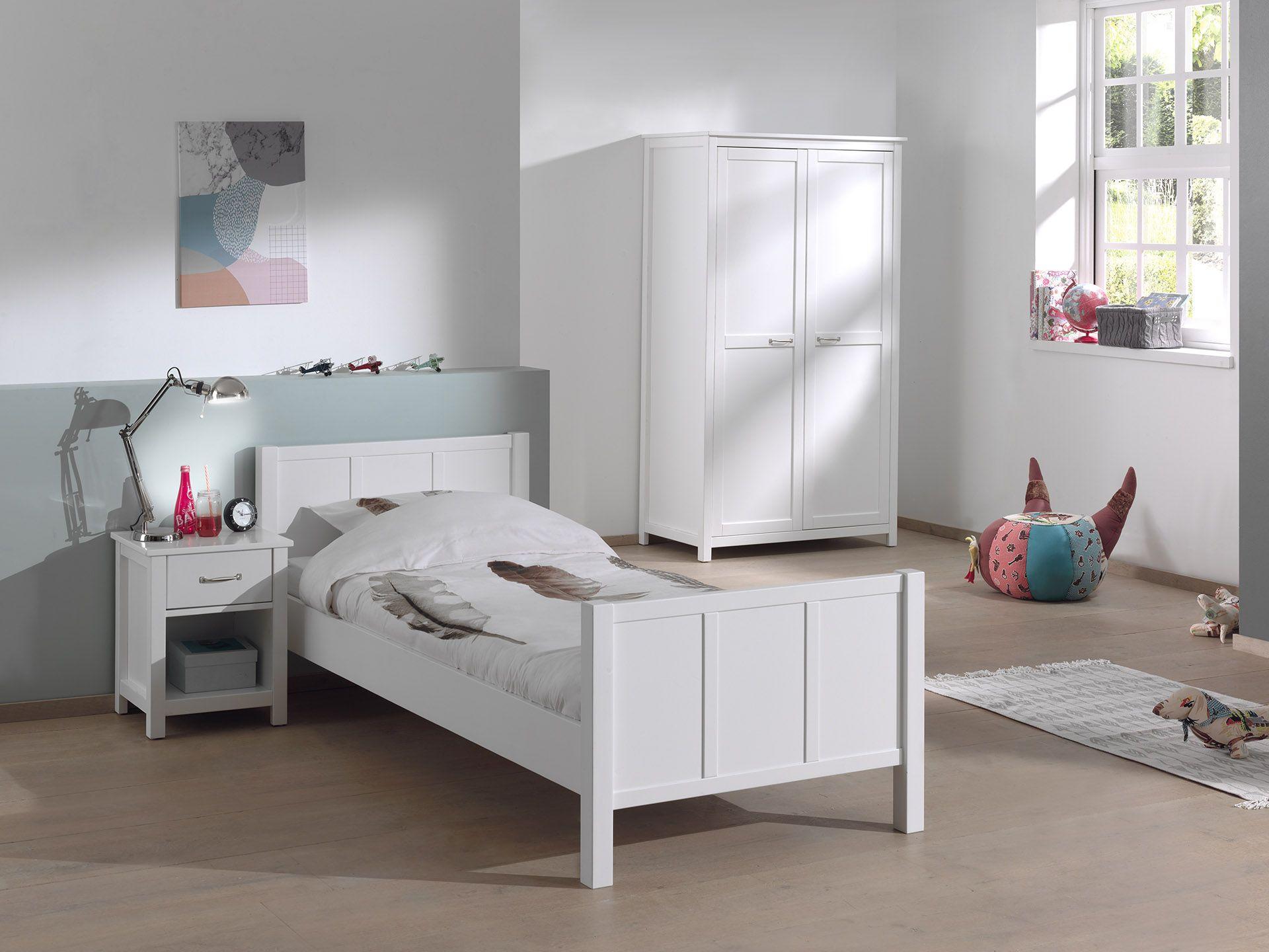 Einzelbett 90x200 cm, mit geradem Kopf- und Fußteil und stabilen Bettpfosten, Bettpfosten Kiefermassiv, Oberfläche weiß lackiert, Kassetten Optik im Kopf- und Fußteil, Kopfteilhöhe ca. 75, Fußteilhöhe ca. 65 cm, nur für einen festen Lattenrostrahmen geeignet, Einlegetiefe für Lattenrost und Matratze beträgt ca. 10 cm, Bodenfreiheit von ca. 20 cm, belastbar bis max. 75 kg, BxHxT: 211 x 75 x 96 cm Nachtkommode mit 1 Schublade und einem großen Fach, Front und Korpus aus hochwertigem MDF, weiß lackiert, Seiten in Rahmenoptik gearbeitet, Bügelgriff aus Metall in Aluoptik, Schubladen Innenmaß BxHxT 29 x 10 x 29 cm, Fachmaß BxHxT 33 x 34 x 36 cm, Bodenfreiheit 6 cm, BxHxT: 45 x 55 x 40 cm Kleiderschrank 2-türig mit 2 Türen, Fronten und Seiten sind in Rahmenoptik gearbeitet, innen oben einen festen und unten einen verstellbaren Ablageboden, sowie eine Kleiderstange, Bodenfreiheit ca. 6 cm, BxHxT: 110 x 190 x 57 cm