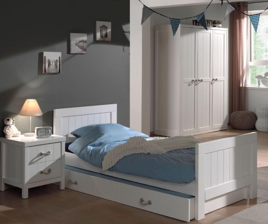 Artikelset Lewis best. aus: Schönes Einzelbett (90x200 cm Liegefläche) mit gradlinigem Kopf- und Fußteil und stabilen Bettpfosten zum Programm Lewis. Das **Material** ist hochwertiges MDF und die Oberfläche ist weiß lackiert. Das Mittelteil vom Kopf- und Fußteil hat eine geplankte Optik womit der Landhaus-Charakter vermittelt wird. Durch die Metall Eckverstrebungen ist das Bett nur für einen festen Lattenrostrahmen geeignet, nicht für einen Rolllattenrost. Die Einlegetiefe für Lattenrost und Matratze beträgt ca. 10 cm. Die Beschläge sind aus Metall. Die Ware ist zerlegt, mit Montageanleitung zur einfachen Selbstmontage. Stellfläche: B: 206 x H: 80 x T: 97 cm. Ergänzend zum Einzelbett Lewis gibt es eine passende Bettschublade mit dem Innenmaß ca. 90x190 cm. Das **Material** ist hochwertiges MDF weiß lackiert. Die Front der Bettschublade hat eine geplankte Optik. Die beiden Griff aus starkem Seil an der Bettseite sind ein nettes Detail und erleichtern gleichzeitig das Herausziehen und Hineinschieben der Bettschublade. Durch den Rollenauszug lässt sich die Schublade einfach bedienen. Die Innenhöhe der Bettschublade ist ca. 12,5 cm. Die durchgehende Bodenplatte ermöglicht, die Schublade als zusätzlichen Stauraum zu nutzen. Der Artikel ist zerlegt, mit Aufbauanleitung zur einfachen Selbstmontage. Die Nachtkonsole mit 2 Schubladen ist passend zum Programm Lewis. Front und Korpus aus hochwertigem MDF, weiß lackiert. Die Seiten sind in Rahmenoptik gearbeitet, was die die klassische LInie mit Landhaus-Charakter unterstreicht. Die Schubladenfronten haben eine geplankte Optik. Die beiden Griffe aus starkem Seil sind ein nettes Detail. Beschläge aus Metall. Der Artikel ist zerlegt, mit Aufbauanleitung zur einfachen Selbstmontage: Stellfläche: B: 50 H: 55 T: 45 cm. Geräumiger Kleiderschrank mit 3 Türen, passend zum Programm Lewis. Der Korpus ist aus hochwertigem MDF, weiß lackiert. Die Fronten und Seiten sind in Rahmenoptik gearbeitet, was die klassische LInie unterstreicht und womit der Landhaus-Charakter vermittelt wird. Das Mittelteil der Türen hat eine geplankte Optik. Die drei Griffe aus starkem Seil sind ein nettes Detail. Innen hat der Kleiderschrank auf der linken Seite oben einen festen und unten einen verstellbaren Ablageboden, sowie eine Kleiderstange. Auf der rechten Seite befinden sich 4 feste Einlegeböden, die prima als Wäschefächer genutzt werden können. Dadurch bietet der Kleiderschrank viel Stauraum. Die Beschläge sind aus Metall. Die Ware ist zerlegt, mit Aufbauanleitung zur einfachen Selbstmontage. Benötigte Stellfläche ca.: B: 146 H: 200 T: 59 cm.