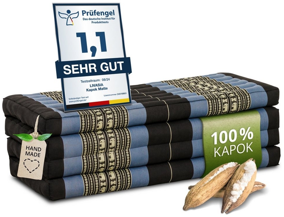 | Name | Klappmatratze Faltmatratze 110 cm breit (Classic) - 200x110x8cm -, livasia, 8 cm hoch, Kapok, vegan, handgefertigt |