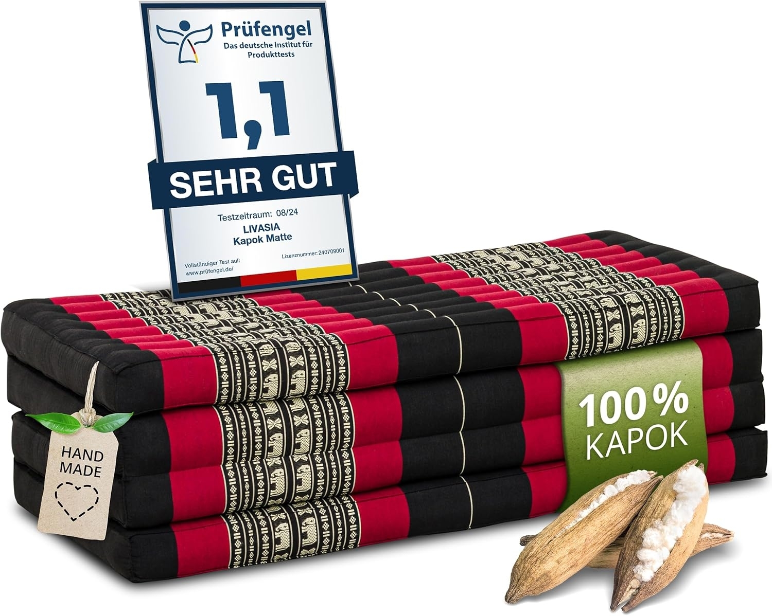 | Beschreibung | Die nachhaltige Klappmatratze von livasia ist mit reinem und unbehandeltem Kapok gefüllt, einer Pflanzendaune des Kapokbaumes. Sie bietet vielseitige Einsatzmöglichkeiten als gemütliche Liegewiese, für Yoga oder als Sitzwürfel. Mit einem traditionellen Thai Muster bringt sie Urlaubsstimmung in Ihr Zuhause. Ideal für Outdoor-Aktivitäten, schützt sie vor Kälte und sorgt für Komfort im Garten oder auf dem Balkon. **Highlights** - Füllung aus 100% Kapok für natürliche Entspannung - Vielseitig einsetzbar als Liegewiese, Sitzwürfel oder für Yoga - Feuchtigkeits- und temperaturisolierend für Outdoor-Nutzung - Handverarbeitet und nachhaltig - Traditionelles Thai Muster für ein besonderes Ambiente **Produkteigenschaften** - Maße aufgeklappt: 200 cm (L) x 110 cm (B) x 8 cm (H) - Maße zusammengeklappt: 53 cm (L) x 110 cm (B) x 32 cm (H) - Gewicht: 20 kg - Marke: livasia, eine Marke der Asia Wohnstudio GmbH - Geprüfte Qualität mit original Label |