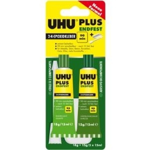 - UHU Plus Endfest ist ein 2-Komponenten-Kleber auf Epoxidharzbasis, der für höchste Anforderungen und Belastungen geeignet ist.