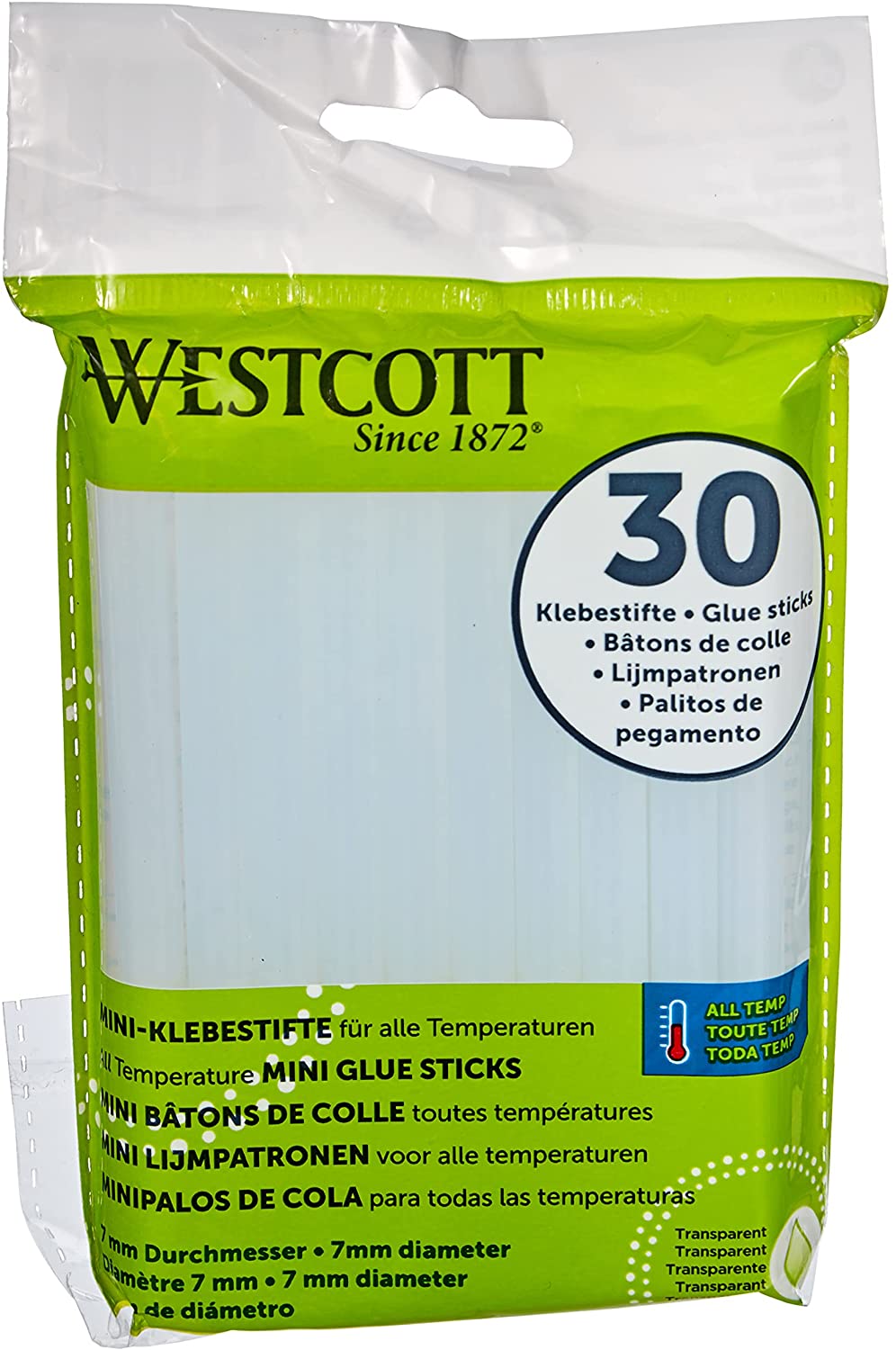 | Name | Westcott Mini-Klebesticks I Set: 30 Stück I 7mm Durchmesser I 102 mm lang I transparent I Patronen für Heißklebepistole I E-16837 00, 7 mm |