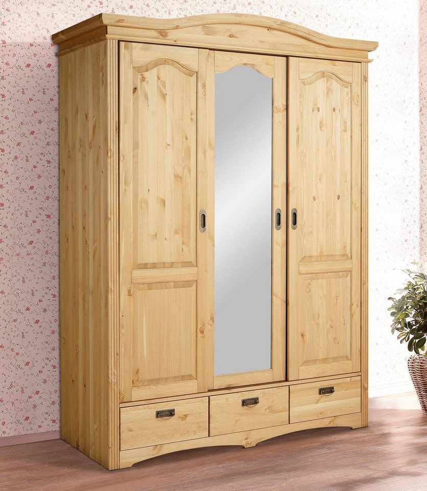 Beschreibung Kleiderschrank »Konrad«. Romantisches Kleiderschrank aus FSC®-zertifiziertem, massivem Kiefernholz, welches aus verantwortungsvoll bewirtschafteten Wäldern stammt. Wahlweise weiß-kirschbaumfarben lackiert (Holzstruktur sichtbar) oder komplett gelaugt/geölt. Schubkästen auf Metallauszügen. Die schön geschwungenen Formen geben diesen Möbeln einen behaglichen Charakter. Der geschmackvolle Kleiderschrank sorgt für eine gemütliche Atmosphäre im Schlafzimmer. In verschiedenen Breiten erhältlich, eignet er sich für jede Raumsituation. Die Schiebetüren ermöglichen es diesen Schrank auch auf engstem Raum problemlos zu öffnen und zu schließen.