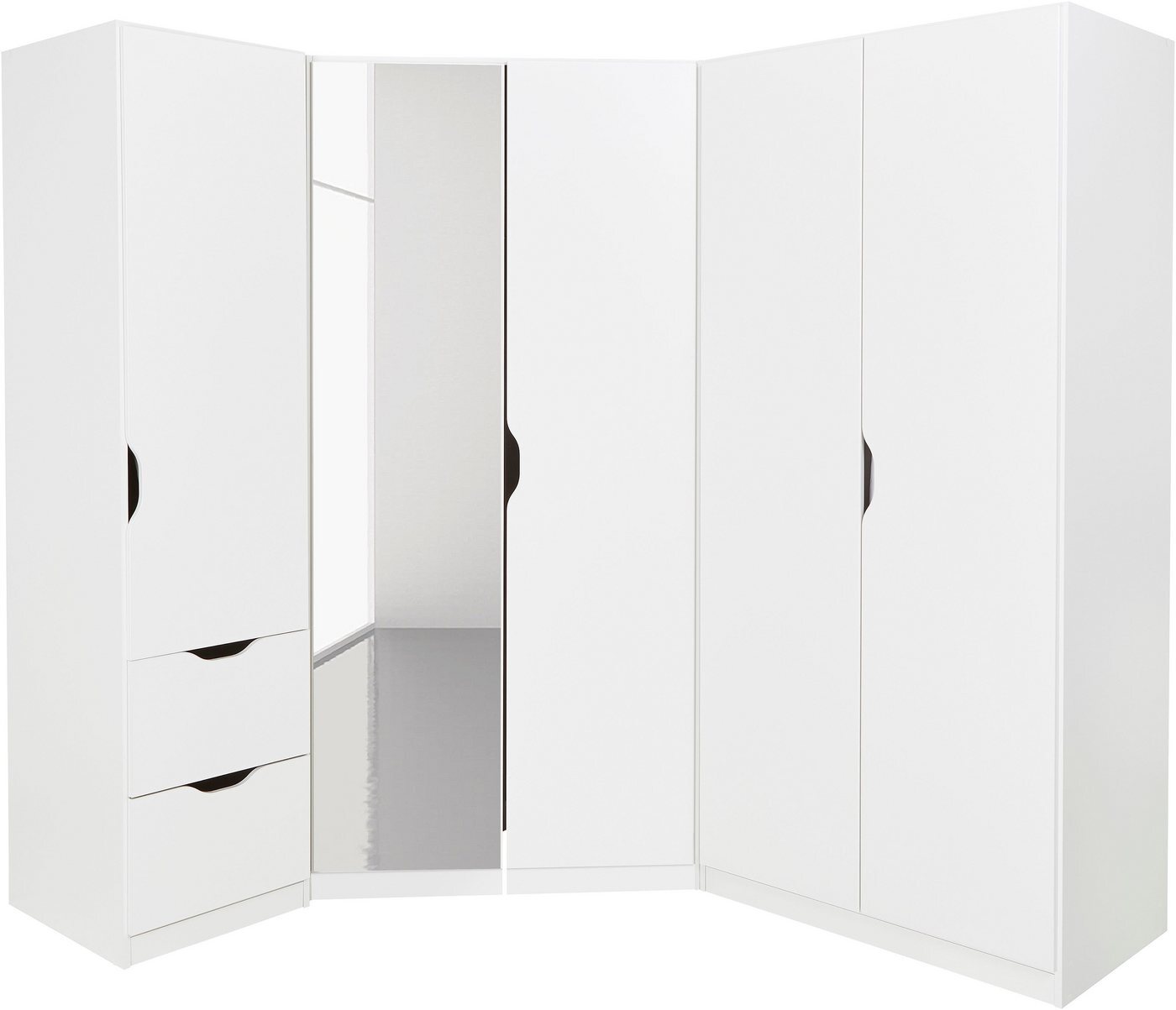 Der 3-tlg. Eckkleiderschrank »Freiham« von rauch bietet eine moderne Lösung zur optimalen Raumnutzung. Das Set besteht aus einem 2-trg. Schrank, einem 1-trg. Schrank und einem Eckschrank mit Spiegelelement. Es sorgt für viel Stauraum und eine übersichtliche Ordnung Ihrer Garderobe. Der ansprechende Skandinavien-Look fügt sich harmonisch in verschiedene Raumkonzepte ein und ermöglicht eine individuelle Aufstellung der Schrankteile. **Highlights** - 3-tlg. Set für optimale Raumnutzung - Eckschrank mit Spiegelelement für zusätzlichen Platz - Viel Stauraum für Kleider, Hemden, Jacken und Shirts - Moderner Skandinavien-Look - Individuelle Aufstellung der Schrankteile **Produkteigenschaften** - 2-trg. Schrank - 1-trg. Schrank - Eckschrank **Lieferumfang** - 2-trg. Schrank - 1-trg. Schrank - Eckschrank mit Spiegelelement - Optionales Zubehör nicht enthalten