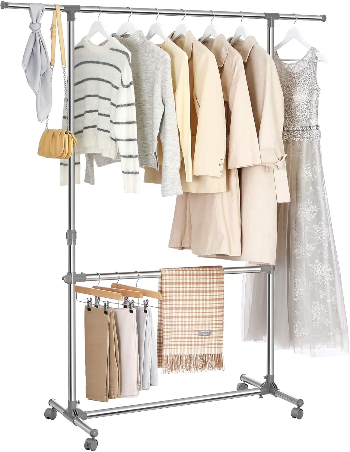 Dieser Kleiderständer eignet sich ideal für Personen mit begrenztem Stauraum oder solche, die ihre Garderobe übersichtlich organisieren möchten. Dabei können sowohl leichte als auch schwere Gegenstände aufgehängt werden – allerdings kann es bei schwereren Stücken vorkommen, dass der Ständer etwas wackelt. Die Rollen ermöglichen ein einfaches Umstellen des Racks in verschiedenen Bereichen wie Schlafzimmer oder Badezimmer.