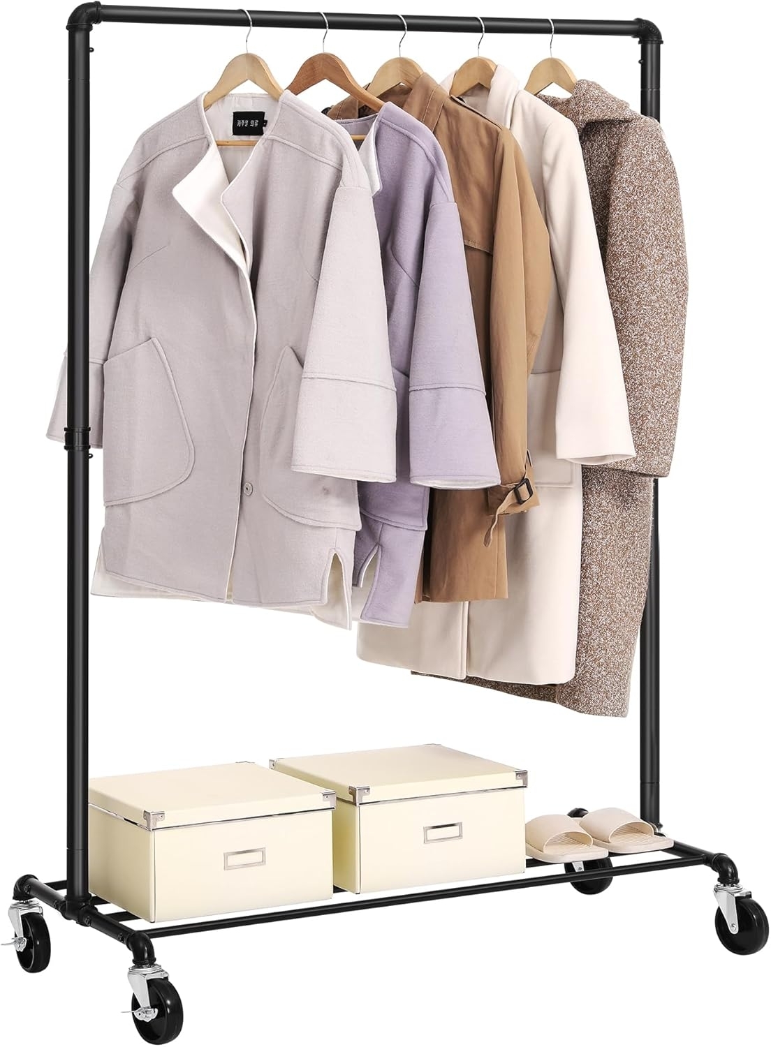 | Name | Songmics Kleiderständer auf Rollen, bis 90 kg belastbar, im Industriedesign, Metall-Garderobenständer mit 1 Kleiderstange und Ablage, Schwerlast, für Schlafzimmer, Waschküche, schwarz |