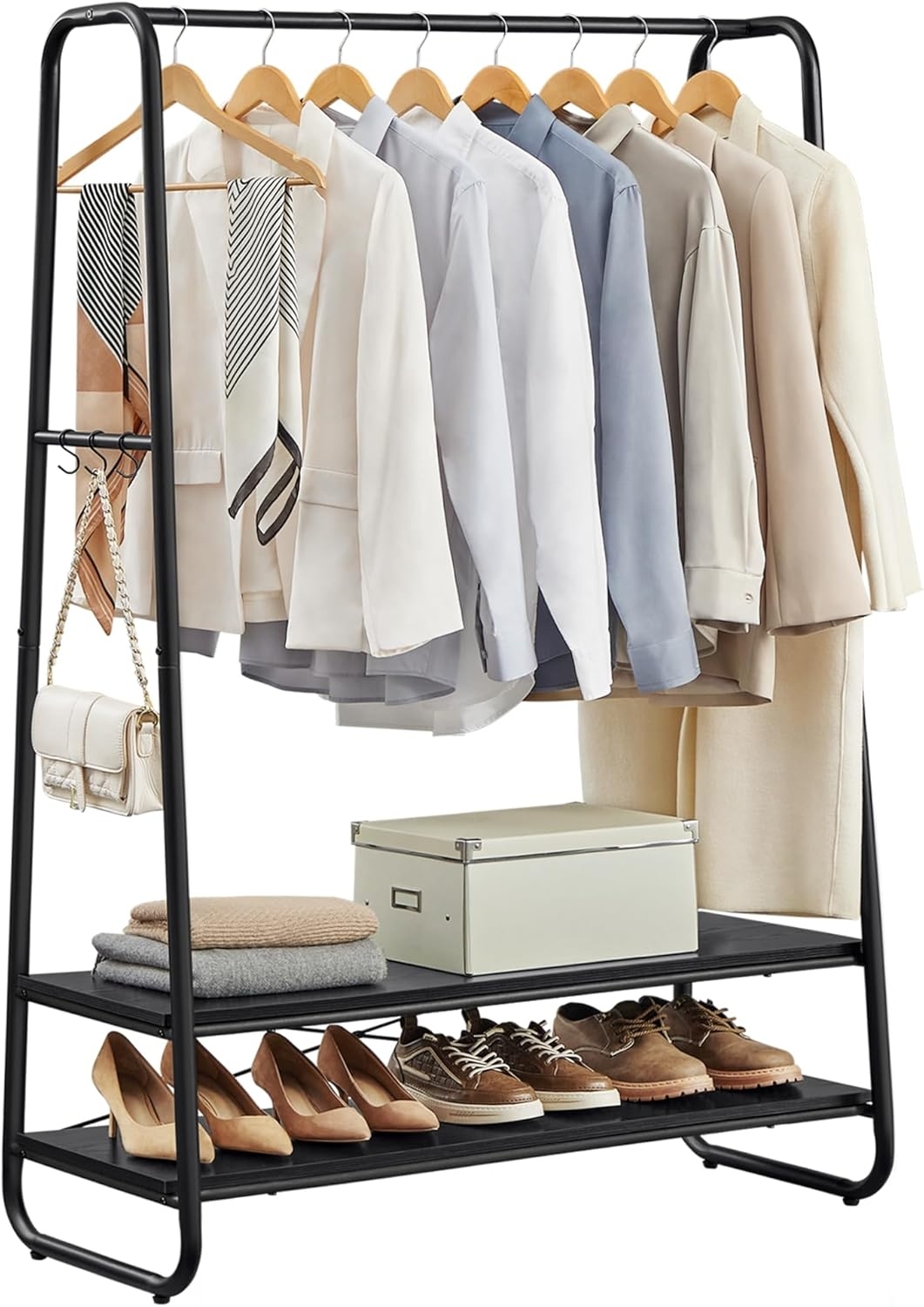 | Name | VASAGLE Kleiderständer, Garderobenständer, Garderobe, 2 Ablagen, 6 Haken in S-Form, Stahlgestell, für Schlafzimmer, Flur, Eingangsbereich, ebenholzschwarz-mattschwarz RGR112B03 |