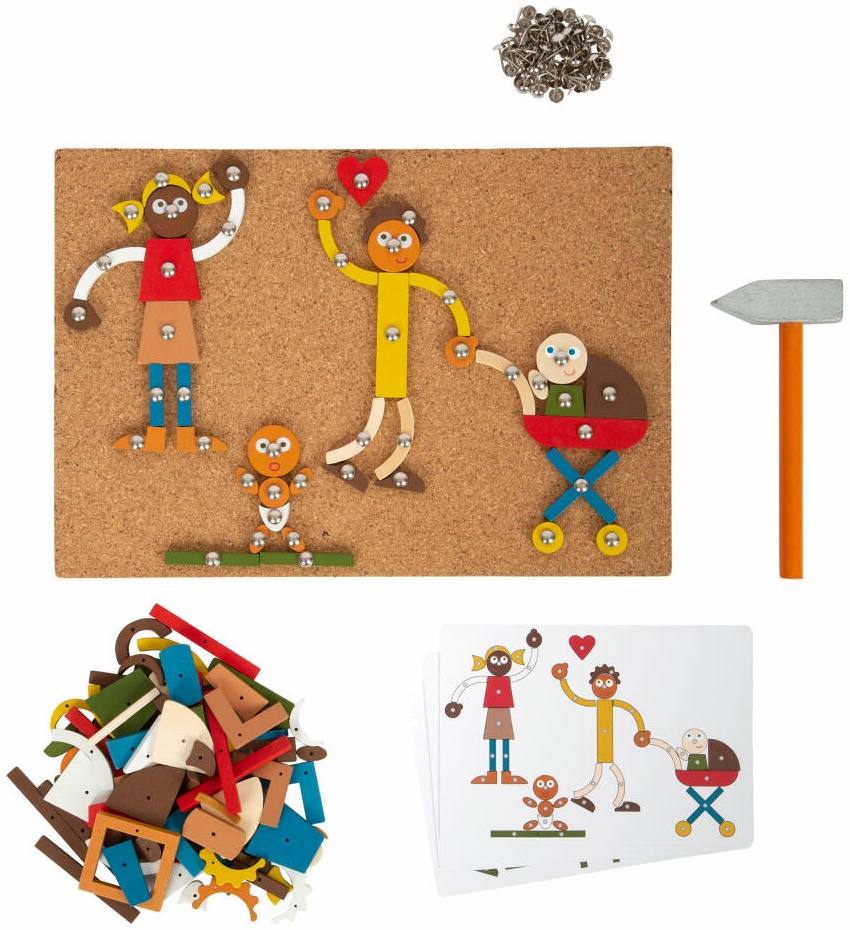 Umfangreiches Kreativ-Set rund ums Thema Familie! Ausgestattet mit Korkbrett, Holzhammer, Ziernägeln und vielen Holzelementen aus Schichtholz, lassen sich mit diesem Hämmerchenspiel zahlreiche Motive aus dem familiären Umfeld wie Eltern, Geschwister, Freunde oder Haustiere erschaffen. Mit 6 Bildvorlagen und Aufbewahrungsbox! Klassisches Nagelspiel in modernen Farben, mit dem fantasievoll verschiedene Menschen aus dem Familien- oder Freundeskreis sowie Themen wie Emotionen oder Diversität dargestellt werden können. Dabei steht die Entscheidung frei, eigene Kreationen zu verwirklichen oder sich an den Bildvorlagen zu orientieren. Beim Erstellen eigener Bilder wird die Kreativität gefördert. Gleichzeitig trainieren Kinder mit Hämmerchenspielen ihre Geschicklichkeit, lernen Farben und Formen besser kennen und verbessern ihre visuelle Wahrnehmung. Vorteil: Hämmmerchenspiele sind für Kinder unterschiedlichen Alters geeignet und bleiben lange spannend.
