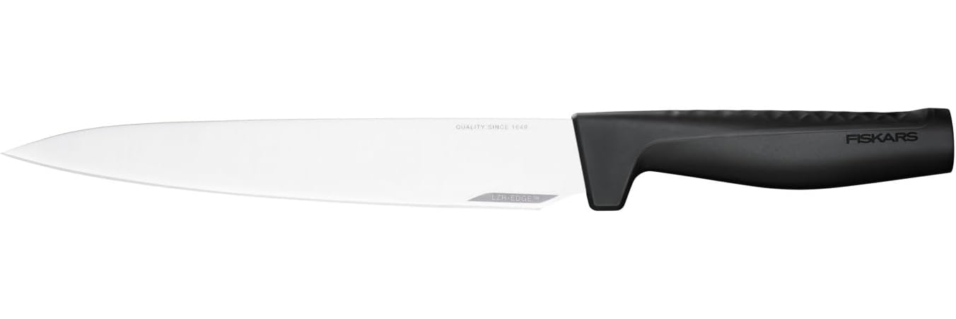 Das Fiskars Hard Edge Tranchiermesser ist ein hochwertiges Küchenmesser, das speziell für das Zubereiten und Tranchieren von Braten entwickelt wurde. Mit seiner geraden und langen Klinge mit feiner Schneide erfüllt es mühelos die täglichen Anforderungen beim Kochen. Die Klinge besteht aus rostfreiem Stahl und verwendet die revolutionäre LZR-EDGE Technologie, die eine viermal längere Schärfe im Vergleich zu herkömmlichen Messern gewährleistet. Der ergonomisch gestaltete Griff mit einem einzigartigen 3D-Muster sorgt für einen perfekten und sicheren Halt. Das Messer ist spülmaschinenfest und wurde in Finnland entworfen. **Highlights** - Schärfe für die tägliche Küche - Hochwertiger japanischer rostfreier Stahl - Ergonomischer Kunststoffgriff mit Softgrip - LZR-EDGE-Technologie für 4-mal längere Schärfe - Spülmaschinenfest **Produkteigenschaften** - Klingenlänge: 21,6 cm - Gesamtlänge: 35,1 cm - Gewicht: 113 g - HRC 52 (Härtegrad) - Schneidleistung (CATRA-Test) - Empfohlene Schärfung mit Fiskars Roll-Sharp oder Wetzstein mit 30+/-4 Winkel - In Finnland entworfen