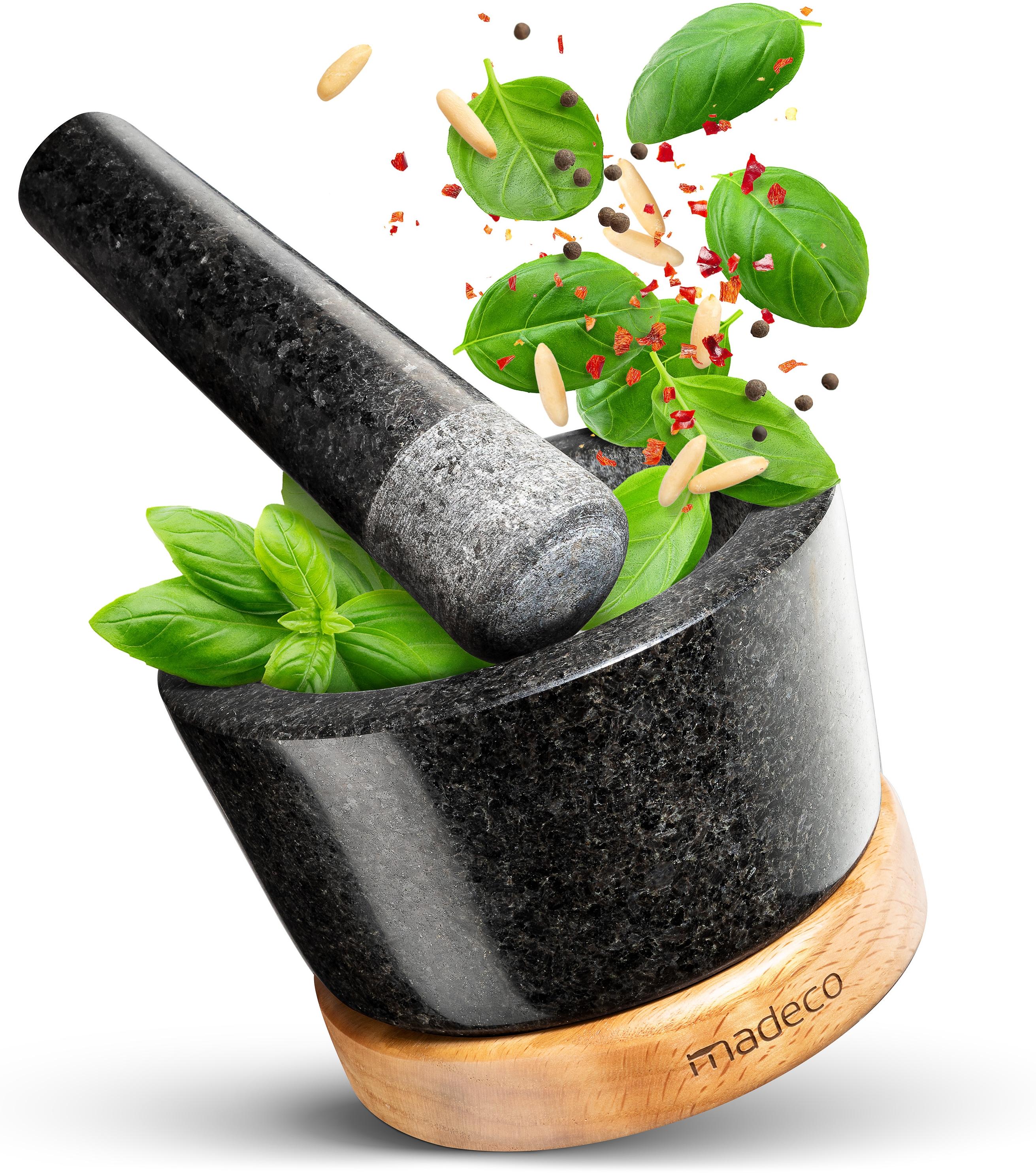 | Name | madeco Mörser mit Stößel Granit auf Holzsockel Eiche Ø 14,5 cm - Perfekt geeignet für Gewürze, Kräuter & Nüsse - Steinmörser Set - Design Granit Mörser & Stößel groß |