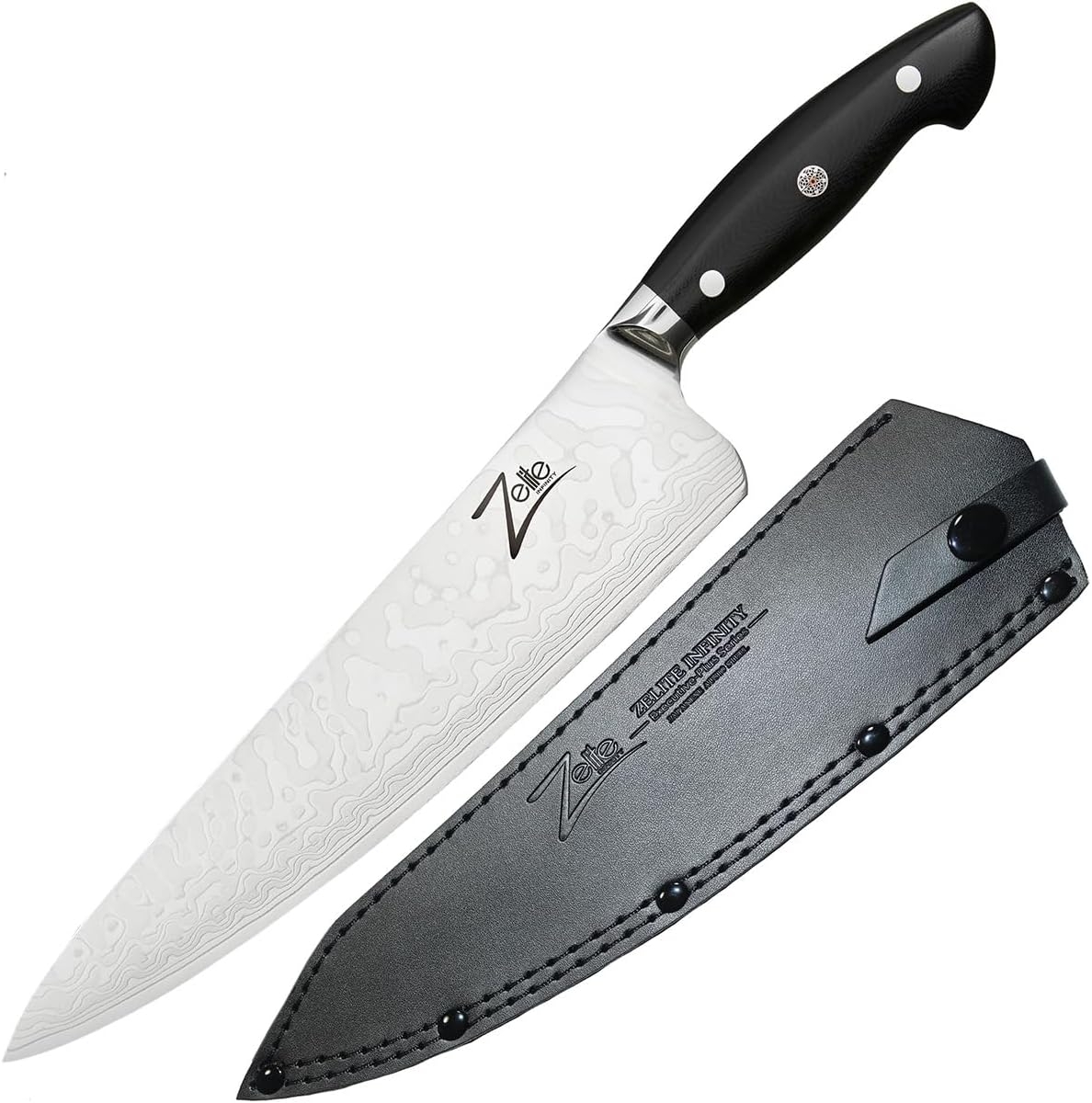 Das Executive-Plus 10" Kochmesser von Zelite Infinity by Klarstein vereint herausragende Leistung und ästhetische Schönheit. Mit einer 25,4 cm langen Klinge aus 45-lagigem japanischem Damaszenerstahl und einem ergonomischen G10-Griff ist es ideal zum Hacken, Schneiden und Würfeln. Die Klinge hat eine Dicke von 2,4 mm und eine Breite von 60 mm, was das Schneiden von großen und harten Lebensmitteln mühelos ermöglicht. **Highlights** - 25,4 cm lange Klinge für vielseitige Anwendungen - Ergonomischer G10-Griff für komfortables Handling - Handgeschärft nach der traditionellen 3-Schritt-Honbazuke-Methode - 45-lagiger japanischer Damaszenerstahl für hohe Qualität - Verpackt in einem stilvollen Aufbewahrungsetui **Produkteigenschaften** - Gesamtmaße: 39 x 6 x 2,8 cm (LxHxB) - Klingendicke: 2,4 mm - Grifflänge: 13,6 cm - Gewicht: ca. 312 g **Lieferumfang** - 1 x Kochmesser 10" - 1 x Lederscheide - mehrsprachige Gebrauchs- und Pflegeanleitung