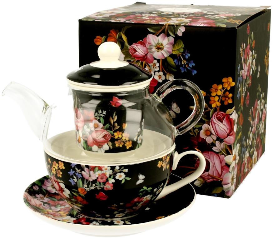 DUO FLORAL Tasse mit Teekanne VINTAGE FLOWERS BLACK Glas - New Bone China Porzellan