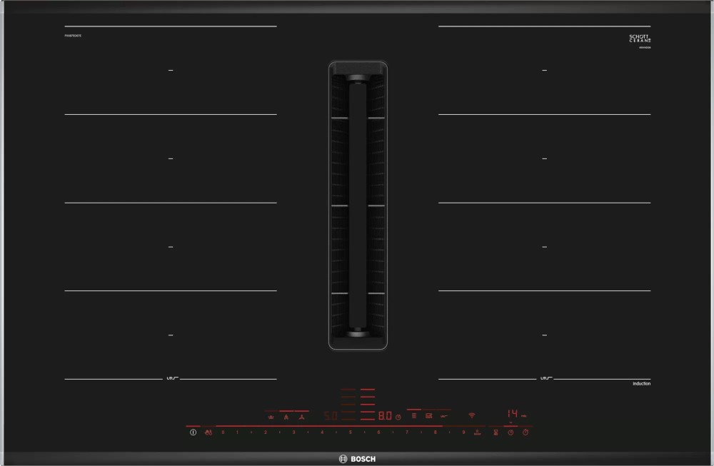 Bosch PXX875D67E Induktionskochfeld mit DunstabzugSerie 8, Energieeffizienzklasse B, Einbaugerät, 4 Zonen, 17 Leistungsstufen, Breite 81,6 cm, schwarz