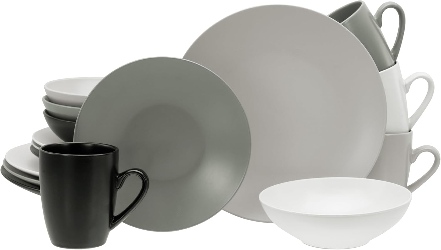 Das CreaTable 25831 Kombiservice Manhattan ist ein stilvolles 16-teiliges Set aus hochwertigem Steinzeug, das für 4 Personen geeignet ist. Es umfasst 4 Speiseteller (27 cm), 4 Dessertteller (21 cm), 4 Mehrzweckschalen (19 cm) und 4 Kaffeebecher (30 cl). Mit seiner modernen Coupeform und den attraktiven Mattglasuren in Schwarz, Grau, Taupe und Creme verleiht es jedem Tisch einen eleganten Look. Das Geschirr ist spülmaschinen- und mikrowellengeeignet. **Highlights** - Trendiges 16-teiliges Kombiservice aus hochwertigem Steinzeug - Moderne Coupeform - Attraktive Mattglasuren in Schwarz, Grau, Taupe und Creme - Seidenmatter Glanz - Spülmaschinen- und mikrowellengeeignet **Produkteigenschaften** - Material: Steinzeug - Farbe: Mehrfarbig (Schwarz, Grau, Taupe, Creme) **Lieferumfang** - 4 Speiseteller (27 cm) - 4 Dessertteller (21 cm) - 4 Mehrzweckschalen (19 cm) - 4 Kaffeebecher (30 cl)