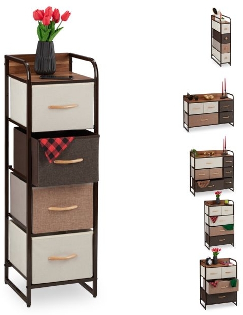 Praktischer Schubladenschrank von Relaxdays mit 4 Stofffächern in stilvollem Design. Die Gesamtmaße betragen ca. 99,5 x 31 x 31,5 cm (H x B x T) und das Gewicht liegt bei ca. 5,3 kg. Der Schrank besteht aus einem Material-Mix aus Polyester, Stahlgestell und MDF-Platte in Brauntönen. Ideal für die platzsparende Aufbewahrung in jeder Ecke, z.B. im Flur, mit Ablagefläche für Kosmetik, Deko oder Schlüssel. **Highlights** - 4 Stofffächer für vielseitige Aufbewahrungsmöglichkeiten - Platzsparendes Design für die Nutzung in jeder Ecke - Ablagefläche für zusätzliche Dekoration oder Aufbewahrung - Leichtes Gewicht von ca. 5,3 kg für einfaches Umstellen - Stilvolle Farbkombination aus verschiedenen Brauntönen **Produkteigenschaften** - Material-Mix: Polyester, Stahlgestell, MDF-Platte - Gesamtmaße: ca. 99,5 x 31 x 31,5 cm (H x B x T) - Gewicht: ca. 5,3 kg - Freistehend und platzsparend - Ideal für Flur, Schlafzimmer oder Badezimmer **Lieferumfang** - 1x Minikommode n. Wahl - Aufbauanleitung u. Montagematerial - Wanddübel inkl. bei A, B, C, E, F - Deko ist nicht enthalten