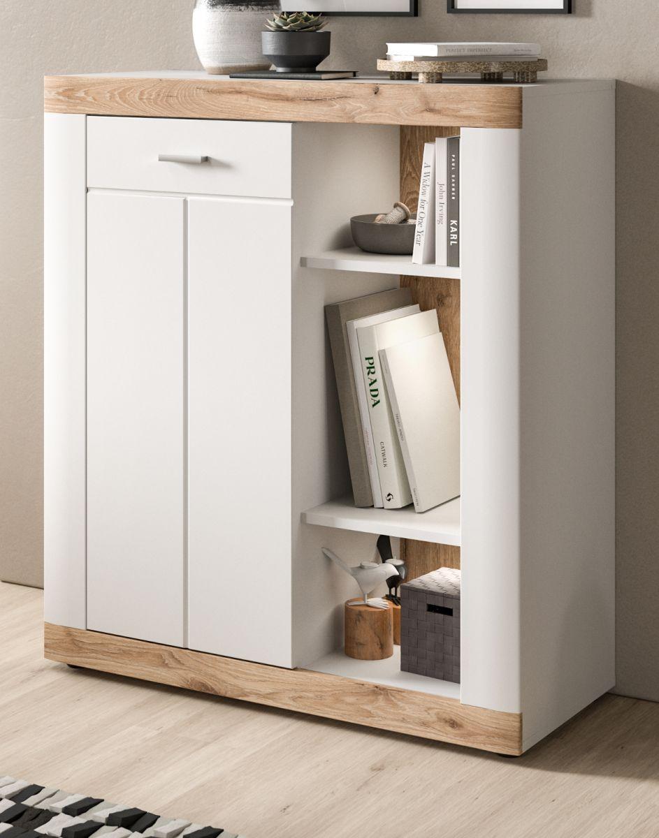 Die Kommode Laredo I in Weiß Matt und Nox Oak ist ein stilvolles Möbelstück für Ihr Zuhause. Die Front besteht aus tiefgezogenem MDF in Weiß Matt, während der Korpus mit weißem Melamin beschichtet ist. Die Absetzung in Nox Oak Dekor verleiht der Kommode einen modernen Look. Mit einer Tür, einem Einlegeboden und drei offenen Fächern bietet sie ausreichend Stauraum für Ihre persönlichen Gegenstände. Die Kunststoffgriffe in Silber und die schwarzen Kunststofffüße runden das Design ab. Die Kommode hat eine Breite von 91 cm, eine Höhe von 104 cm und eine Tiefe von 40 cm. **Highlights** - Stilvolles Design mit tiefgezogener MDF-Front in Weiß Matt - Absetzung in Nox Oak Dekor für einen modernen Look - Praktischer Stauraum mit einer Tür, einem Einlegeboden und drei offenen Fächern - Softclose-Beschläge für sanftes Schließen der Tür - Einfache Montage dank übersichtlicher Aufbauanleitung **Produkteigenschaften** - Front: Weiß Matt MDF tiefgezogen - Korpus: Weiß Melamin - Absetzung: Nox Oak Dekor - Eine Tür, ein Einlegeboden, drei offene Fächer - Beschläge mit Softclose-Funktion - Kunststoffgriffe in Silber - Kunststofffüße in Schwarz - Maße: Breite: 91 cm, Höhe: 104 cm, Tiefe: 40 cm **Lieferumfang** - 1x Kommode Laredo I - Weiß Matt / Nox Oak - Optionale Unterbauspots sind nicht im Lieferumfang enthalten. Bitte beachten Sie, dass dieser Artikel zerlegt geliefert wird. Eventuell abgebildete Dekorationsartikel, Beleuchtungen, Hi-Fi-Geräte oder ähnliches sind nicht im Lieferumfang enthalten.