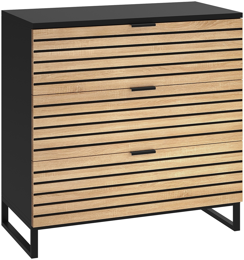 **Kompakte Kommode mit Komfort** Die Kommode Luvua von Bellamio mit drei Schubladen ist die ideale Lösung für alle, die stilvollen Stauraum auf kleiner Fläche suchen. Ob im Schlafzimmer, im Flur oder im Wohnbereich – dieses Möbelstück kombiniert klare Linien mit praktischer Funktionalität und bringt Ordnung in Ihren Alltag. **Viel Stauraum auf wenig Fläche** Drei geräumige Schubladen bieten ausreichend Platz für Kleidung, Dokumente oder Alltagsgegenstände. Dank der durchdachten Innenaufteilung behalten Sie stets den Überblick und können den vorhandenen Stauraum optimal nutzen. **Sanftes Öffnen und Schließen** Ausgestattet mit hochwertigen Gleitschienen lassen sich die Schubladen besonders leichtgängig bedienen. Das sanfte Ein- und Ausziehen sorgt für mehr Komfort und reduziert den Verschleiß im täglichen Gebrauch – ideal für häufig genutzte Räume. **Materialmix mit Charakter** Die Fronten in Eichenoptik verleihen der Kommode eine warme, natürliche Ausstrahlung, während der schwarze Korpus aus robuster Spanplatte für einen modernen Kontrast sorgt. Die glatte Oberfläche lässt sich leicht reinigen und macht das Möbelstück alltagstauglich und pflegeleicht. **Stabile Füße aus Stahl** Das pulverbeschichtete Stahlgestell verleiht der Kommode nicht nur Stabilität, sondern auch einen leichten, schwebenden Look. Die klaren Linien des Metallrahmens passen perfekt zu modernen Wohnstilen und sorgen für sicheren Stand. **Produktdetails:** - Maße: 80 x 40 x 80 cm (H x T x B) - Material: Spanplatte (Korpus), MDF (Front), Stahl - Front: MDF in Holzoptik, Korpus in Schwarz - Schubladen: 3 mit hochwertigen Gleitschienen - Füße & Griffe: Stahl, pulverbeschichtet - Aufbau: Lieferung zur Selbstmontage inkl. Anleitung