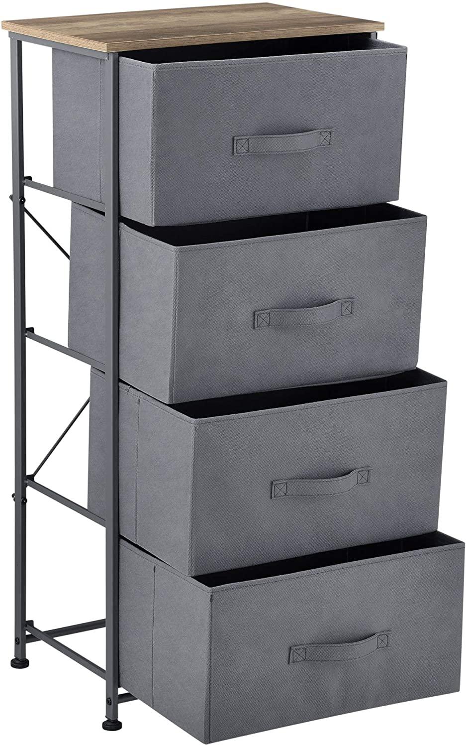 Diese stilvolle Kommode mit 4 Schubladen bietet praktischen Stauraum und fügt sich harmonisch in jeden Haushalt ein. Das stabile Gestell aus Metall sorgt für Langlebigkeit, während die Schubladen aus Vliesstoff und die furnierte MDF-Ablage eine ansprechende Optik bieten. **Highlights** - Stylische Kommode mit 4 Schubladen - Vielseitig nutzbarer Stauraum - Stabiles Gestell aus Metall **Produkteigenschaften** - Maße (HxBxT): 95 x 45 x 30 cm - Korpus: Metall - Schubladen: Vliesstoff - Ablage: MDF, furniert - Farbe: Korpus und Schubladen: Grau, Ablage: Holzfarben **Lieferumfang** - 1 x Kommode