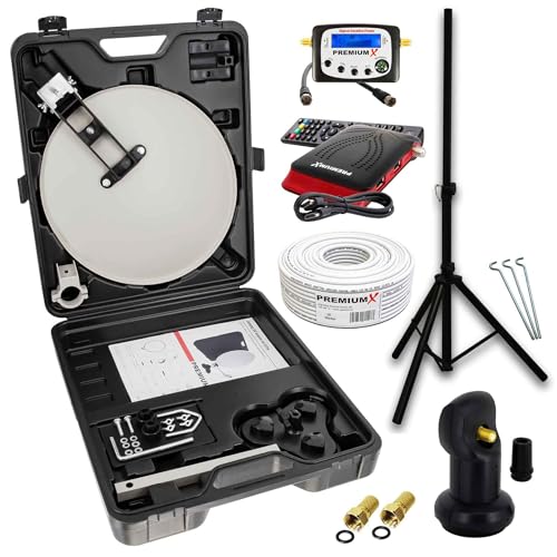 in KomplettanlagenPremiumX Mobile Camping SAT Anlage Satellitenschüssel TV Receiver Satelliten-Finder Single LNB 10m Kabel Koffer Camp Stativwettergeschütztes LNB mit 0,1 dB Rauschmaß, 4K und 3D Unterstützung, stabiles Camp Stativ