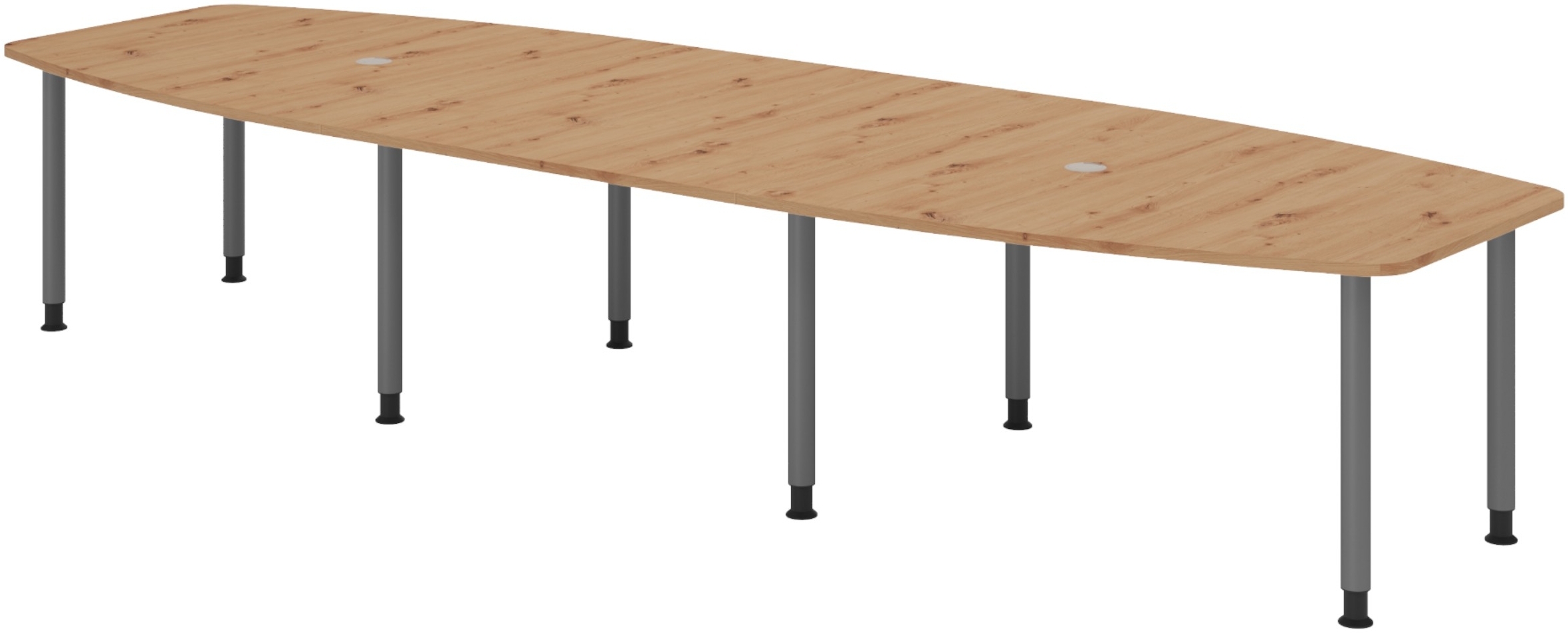 Der bümö Konferenztisch oval mit den Maßen 400 x 130 cm ist die perfekte Wahl für Besprechungsräume und Meetingbereiche. Er bietet Platz für bis zu 14 Personen und überzeugt durch seine hochwertige Verarbeitung in Asteiche sowie ein robustes Gestell in Graphit. Mit einer Höhe von 74 cm und einer stabilen, melaminharzbeschichteten Tischplatte ist dieser Tisch ideal für professionelle Einsätze. **Highlights** - Platz für bis zu 14 Personen - 2 Kabeldosen inklusive für optimale Anschlussmöglichkeiten - Abgerundete Duo-Tischkante für ein modernes Design - Robuste 2,5 cm starke Tischplatte für hohe Kratzfestigkeit - Einfache und schnelle Montage durch durchdachte Konstruktion **Produkteigenschaften** - Höhe: 74 cm - Breite: 400 cm - Tiefe: 130/85 cm - Tischfüße aus 6 cm Stahlrundrohr, verchromt oder lackiert - Belastbarkeit: bis 100 kg - 3-teilige Tischplatte für einfache Handhabung - Top-Markenqualität für den professionellen Einsatz **Lieferumfang** - Konferenztisch bümö oval 400 x 130 cm - 2 Kabeldosen - Teilmontierte Lieferung für einfachen Aufbau
