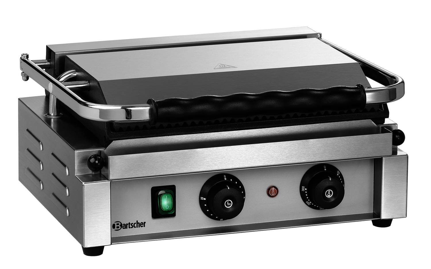 - Der Bartscher Kontaktgrill Panini verfügt über eine große Grillfläche mit einer oberen Grillplatte von 340 mm Breite und 220 mm Tiefe sowie einer unteren Grillplatte von 360 mm Breite und 240 mm Tiefe.