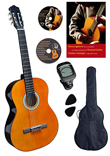 Konzertgitarre 4 4Clifton, Starter Set, laminierte Fichtendecke, Farbe Palisander mit cremefarbigen Randeinlagen, inkl. Tasche gepolstert mit Rucksackriemen, Lehrbuch mit vielen Hits und Karoke-CD, Lern DVD, Cliptuner (Stimmgerät) mit LCD-Nadelanzeige mit Hintergrundbeleuchtung, 2 Plektren, Rosewood Griffbrett und Brücke