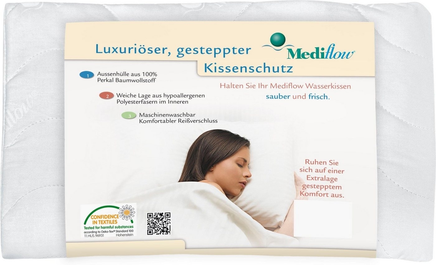 Mediflow Wasserkissen mit gesteppter Luxus Schonbezug 5020 in der Größe 40x80 cm bietet optimalen Schutz für Ihr Wasserkissen. Der Bezug überzeugt durch eine komfortable Steppung und eine 3-Lagen Verarbeitung des Materials. Er lässt sich einfach unter dem normalen Kissenbezug anbringen und kann gewaschen werden, wodurch Ihr Kopfkissen geschont wird. **Highlights** - Gesteppter Luxus Schonbezug für zusätzlichen Komfort - 3-Lagen Verarbeitung für optimale Haltbarkeit - Schützt Ihr wertvolles Wasserkissen - Passt auch auf andere handelsübliche Kopfkissen - Waschbar für einfache Pflege **Produkteigenschaften** - Maße: 40x80 cm - 1-tlg. Set - Material: Hochwertige Textilien