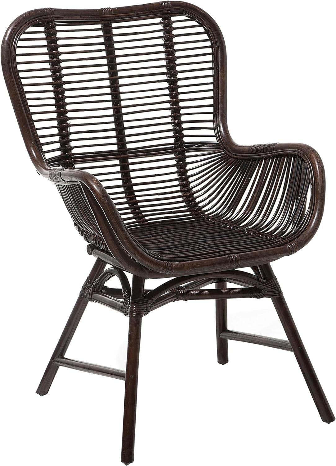 Wunderschöner Rattanstuhl in Braun, ideal für entspannte Stunden. Die geschwungene Form und die hohe Rückenlehne bieten optimalen Komfort. Hergestellt aus robustem, pflegeleichtem Rattan in einem natürlichen, dunkelbraunen Farbton, sorgt der Stuhl für eine luftige, sommerliche Ausstrahlung. Mit einem stabilen Gestell und einer maximalen Belastung von 150 kg ist er perfekt für den Innenbereich geeignet. **Highlights** - Handgefertigt mit viel Liebe zum Detail - Bequem geformte Armlehnen für zusätzlichen Komfort - Feste und komfortable Sitzfläche - Zeitloses Design, das in jede Einrichtung passt - Nur für Innenräume geeignet **Produkteigenschaften** - Typ: Esszimmerstuhl - Stil: Boho - Farbe: Braun - Gestellfarbe: Braun - Farbton: Dunkelbraun - Material: Rattan - Gestellmaterial: Rattan - Sitzmaterial: Rattan - Armlehnen: Ja - Finish: Matt - Stapelbar: Nein - Höhe Armlehnen: 66 cm - Tiefe: 61 cm - Sitzhöhe: 45 cm - Breite: 62 cm - Höhe: 96 cm - Sitzfläche: 46 x 33 cm - Gewicht: 7 kg - Max. Belastung: 150 kg **Lieferumfang** - 1 x Stuhl - Beine / Füße nicht montiert