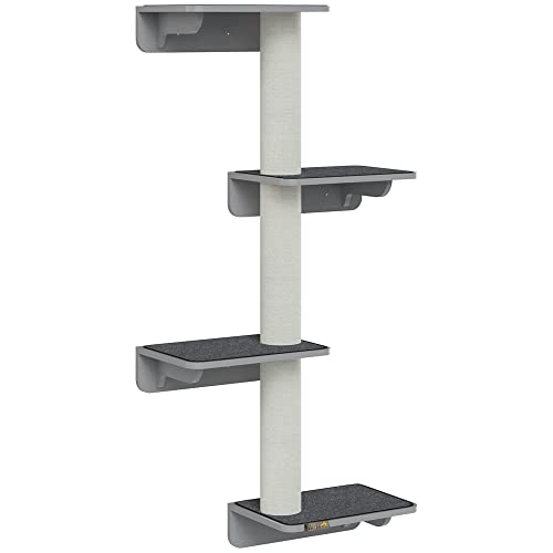 PawHut Wandkratzbaum Katzen-Kletterwand Kratzbaum Katzenmöbel für die Wand Kletterspaß für Katzen Wandmontage Holz Hellgrau+Beige 66 x 28 x 137 cm