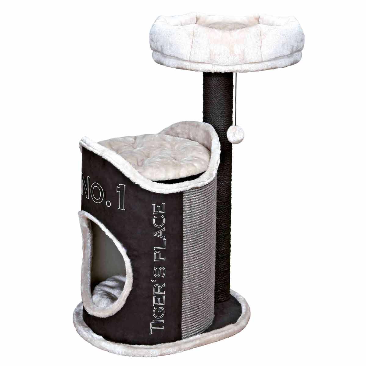 - Der Kratzbaum bietet drei Liegeplätze und ein Spielzeug, das an einem Band am Stamm befestigt ist.