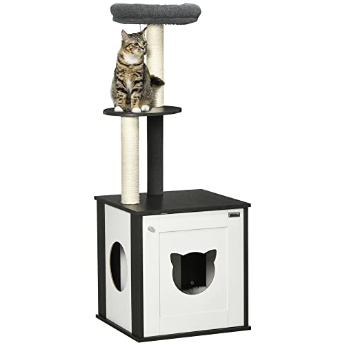 PawHut Kratzbaum mit Katzenschrank 2 in 1 Katzenbaum mit Katzentoilette, 131,5H cm, Kletterbaum mit Sisalsäulen und Katzenbett, Katzenturm mit Aufbewahrungsschrank, Dunkelgrau+Weiß