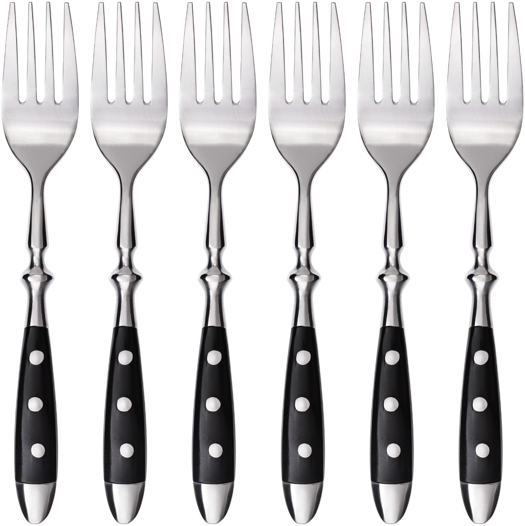 - Die Gabeln verfügen über schwarze Kunststoffgriffe, die dreifach mit Edelstahl-Nieten vernietet sind.