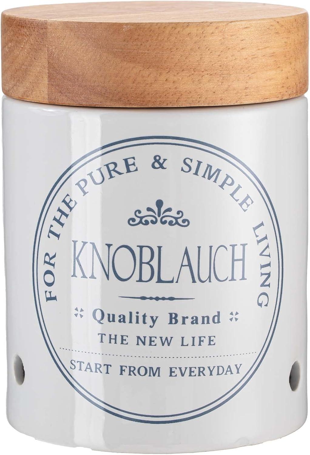 | Name | KHG Knoblauchtopf Keramik Steingut für 250g Knoblauchknollen, Knoblauch Aufbewahrung in Weiß, Holzdeckel Bambus, glasiert mit Emaille, Knoblauchdose rund, Lüftungslöcher, Landhaus Küche |