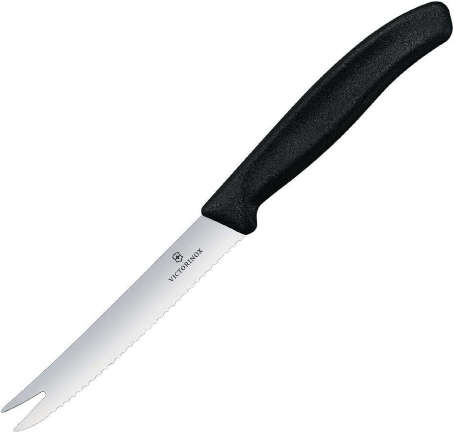 Entdecken Sie das Victorinox Swiss Classic Wurstmesser mit Gabelspitze, das Präzision und Vielseitigkeit vereint. Mit einer scharfen Klinge von 11 cm Länge gleitet es mühelos durch Hart- und Weichkäse sowie verschiedene Wurstwaren. Der ergonomisch gestaltete schwarze Griff sorgt für maximalen Komfort und Kontrolle, selbst bei längerem Einsatz. Dieses hochwertige Küchenwerkzeug ist ideal für den täglichen Gebrauch und besondere Anlässe. **Highlights** - Scharfe Klinge von 11 cm für präzise Schnitte - Innovative Gabelspitze zum einfachen Aufspießen und Servieren - Ergonomischer Griff für maximalen Komfort - Langlebig und zuverlässig, hergestellt von Victorinox - Perfekt für Käseliebhaber und Küchenprofis **Produkteigenschaften** - Farbe: Silber / Schwarz - Material: Kunststoffgriff - Hersteller- und Produktnummer: Victorinox Swiss Classic 6.7863